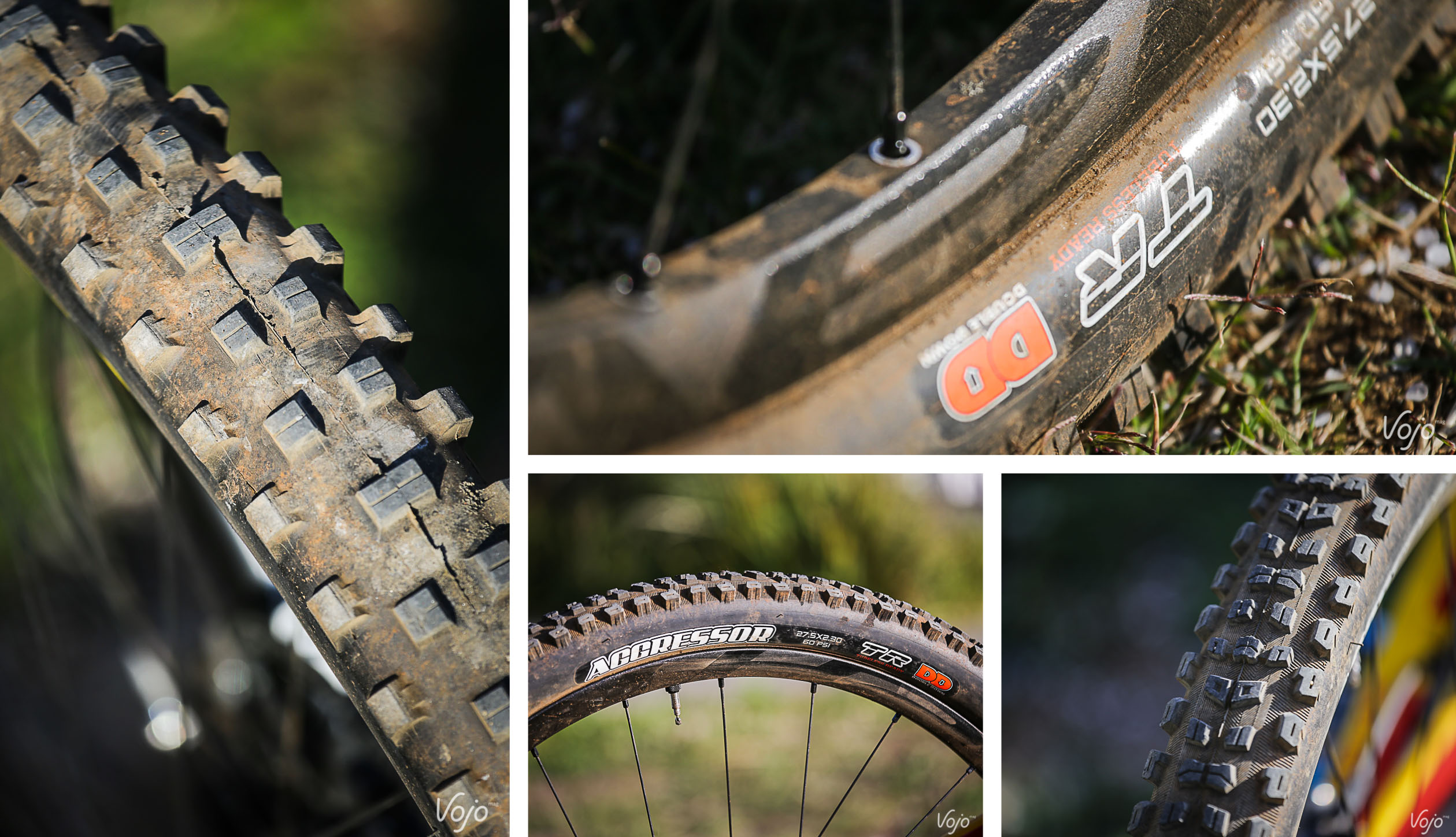Cette année, Damien Oton est passé en gommes Maxxis sur son DeVinci Spartan. « Ici, pour le terrain très sec et fuyant des deux manches d’Amérique Latine, j’ai sélectionné le Shorty à l’avant, avec de gros crampons bien carrés, et le nouvel Agressor à l’arrière. Tous les deux sont en Double Down, qui est une carcasse type DH allégée, parfaite pour l’enduro. On reste à 1100g par pneu, mais on ne prend pas de risque. » Les roues sont des Easton Haven alu.