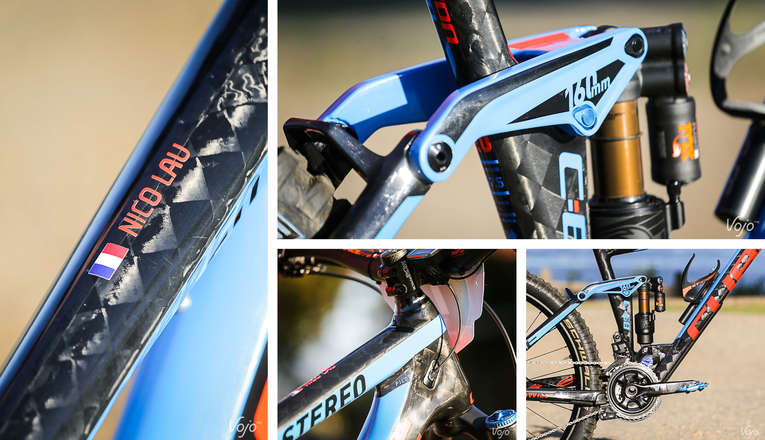 Par rapport au vélo qu’il nous avait présenté lorsque nous lui avons rendu visite en octobre dernier pour une longue interview, le Cube Stereo C:68 de Nicolas Lau a connu quelques modifications : « C’est toujours le Stereo en 160mm de débattement, mais dans une version qui préfigure le modèle 2017. C’est un taille L et on a cherché à gratter un peu au niveau de la peinture. Cela donne un look plus sobre au vélo, cela permet de gagner un peu de poids et on laisse entrevoir le large tressage typique des fibres C:68, les plus légères disponibles chez Cube. »