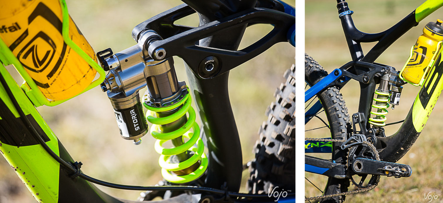 Le débattement est de 155mm avec un amortisseur Stendec Extreme Shox Storia. « Il s’agit du seul amortisseur à ressort équipé d’un blocage, indispensable pour les liaisons. Il dispose d’un réglage de la compression hautes et basses vitesses, ainsi que du rebond. On l’équipe d’un ressort acier light en 350 avec peinture custom pour le vélo. Il est règlé avec un SAG de 27%. »