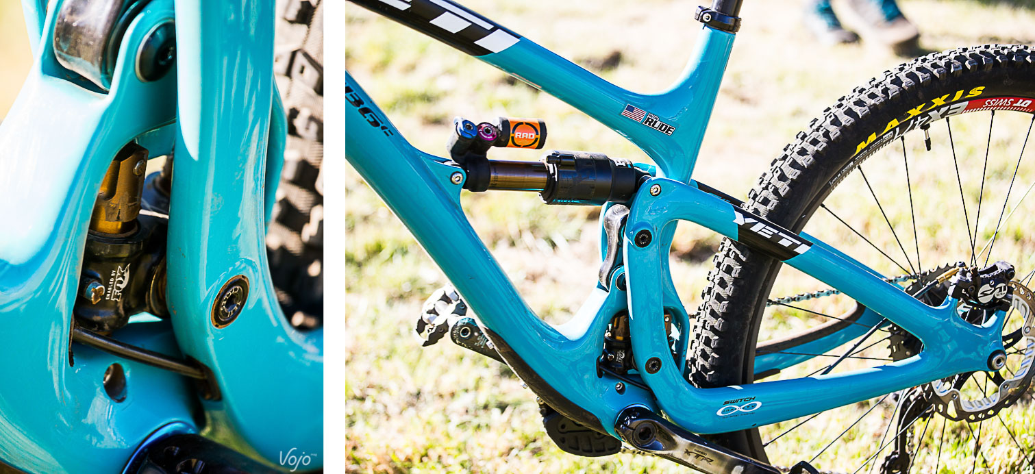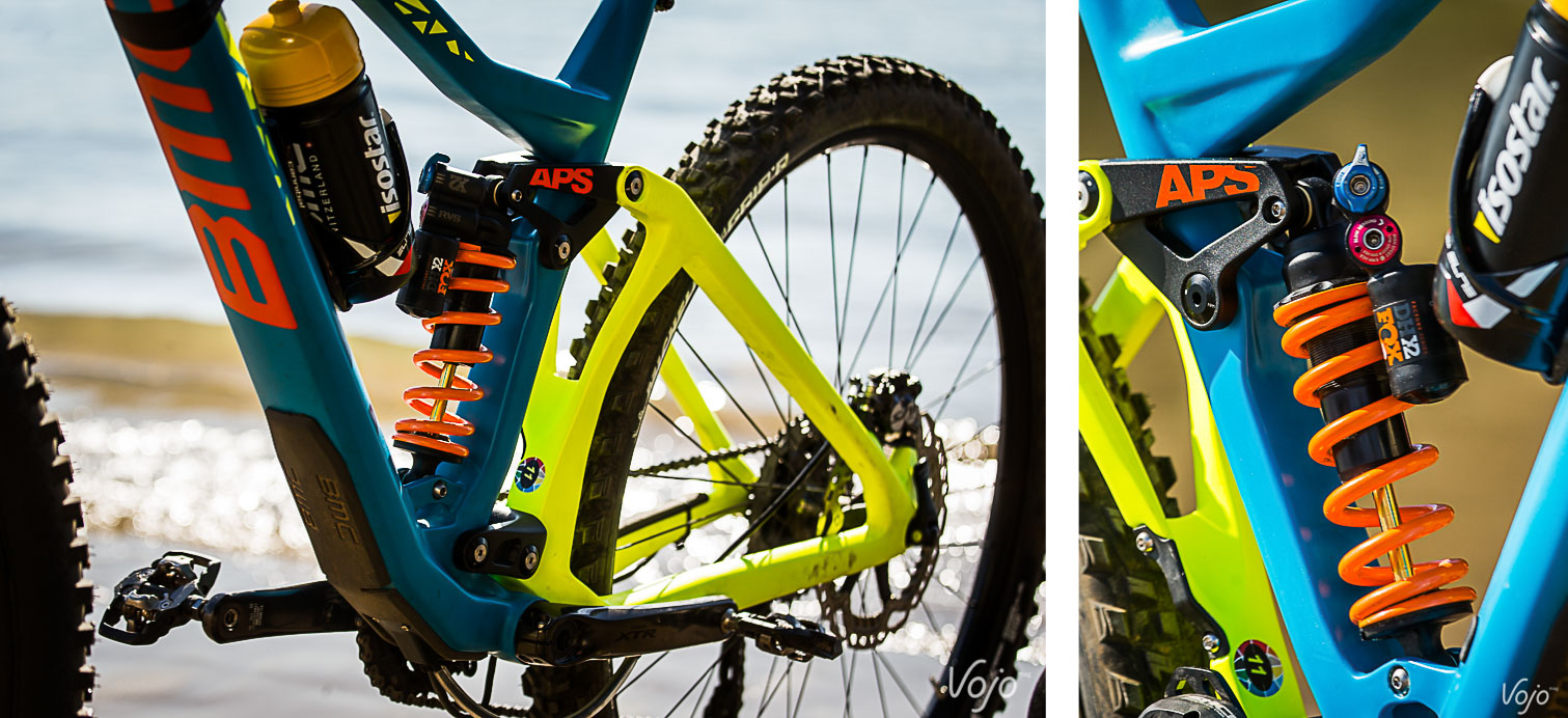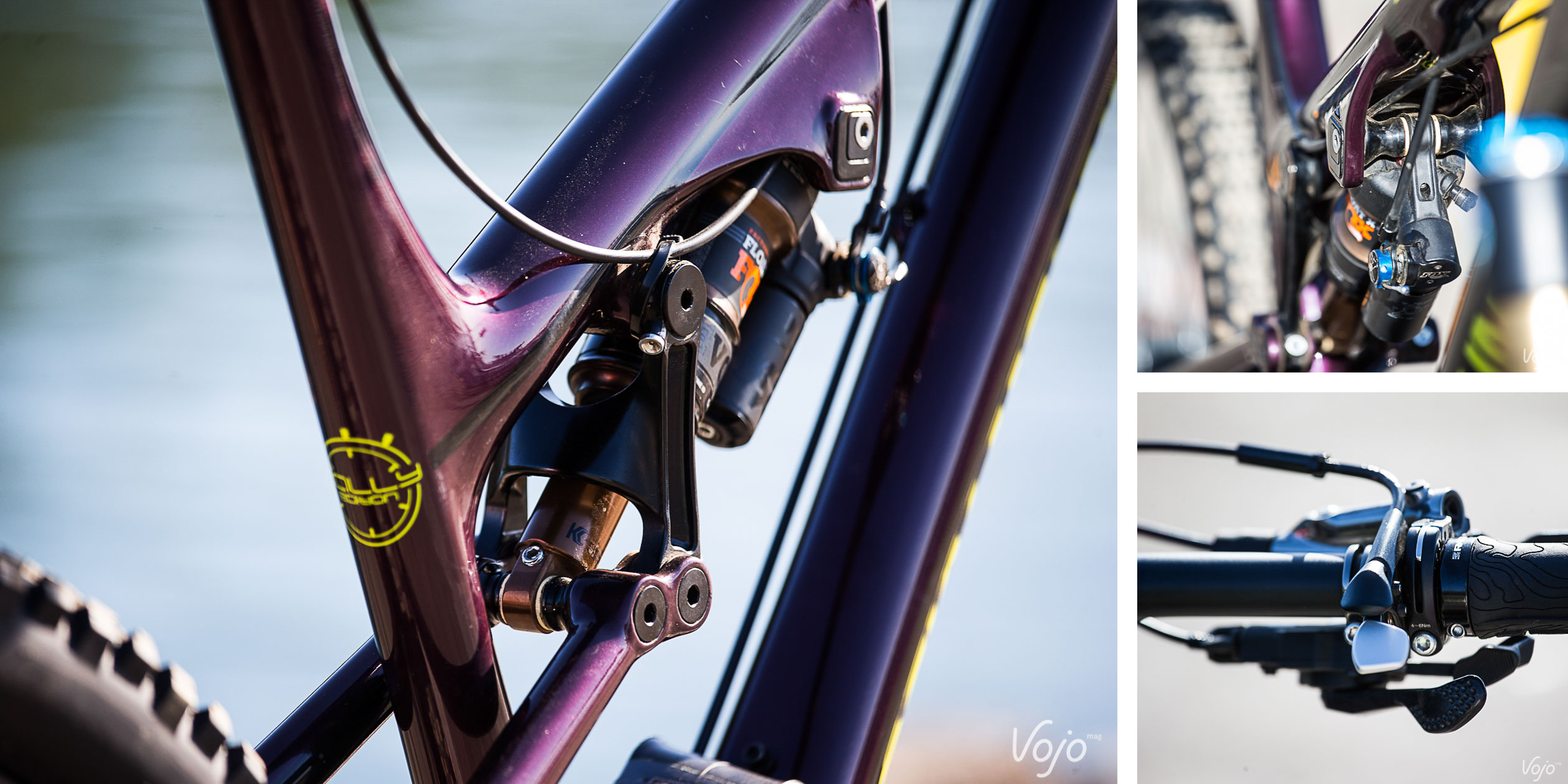A l’arrière, la suspension Switch Infinity développée par Yeti utilise une pièce spécifique, sorte de double mini-amortisseur fabriqué par Fox, qui permet un déplacement vertical du point de pivot principal. Richie Rude l’associe à un amortisseur Fox Float X2.