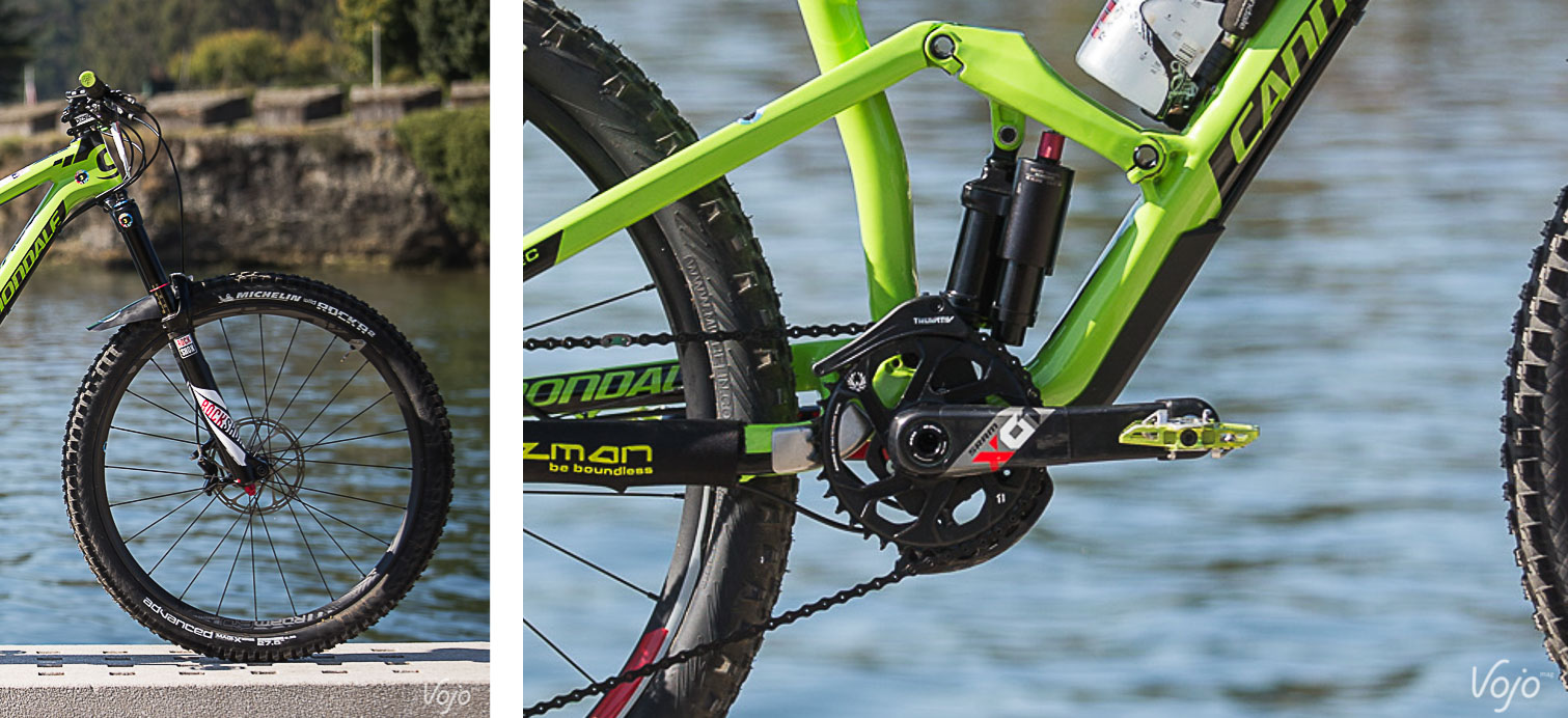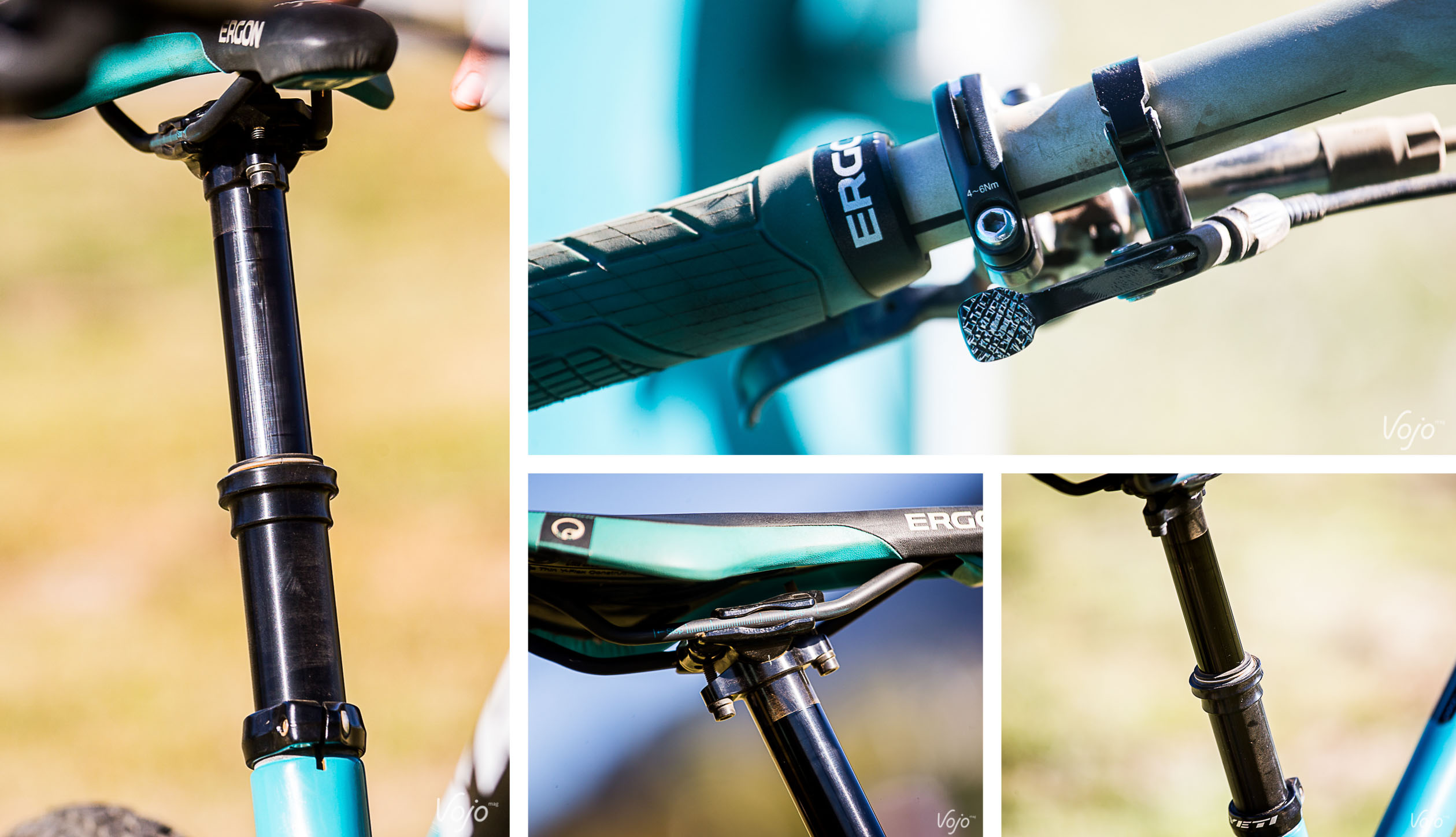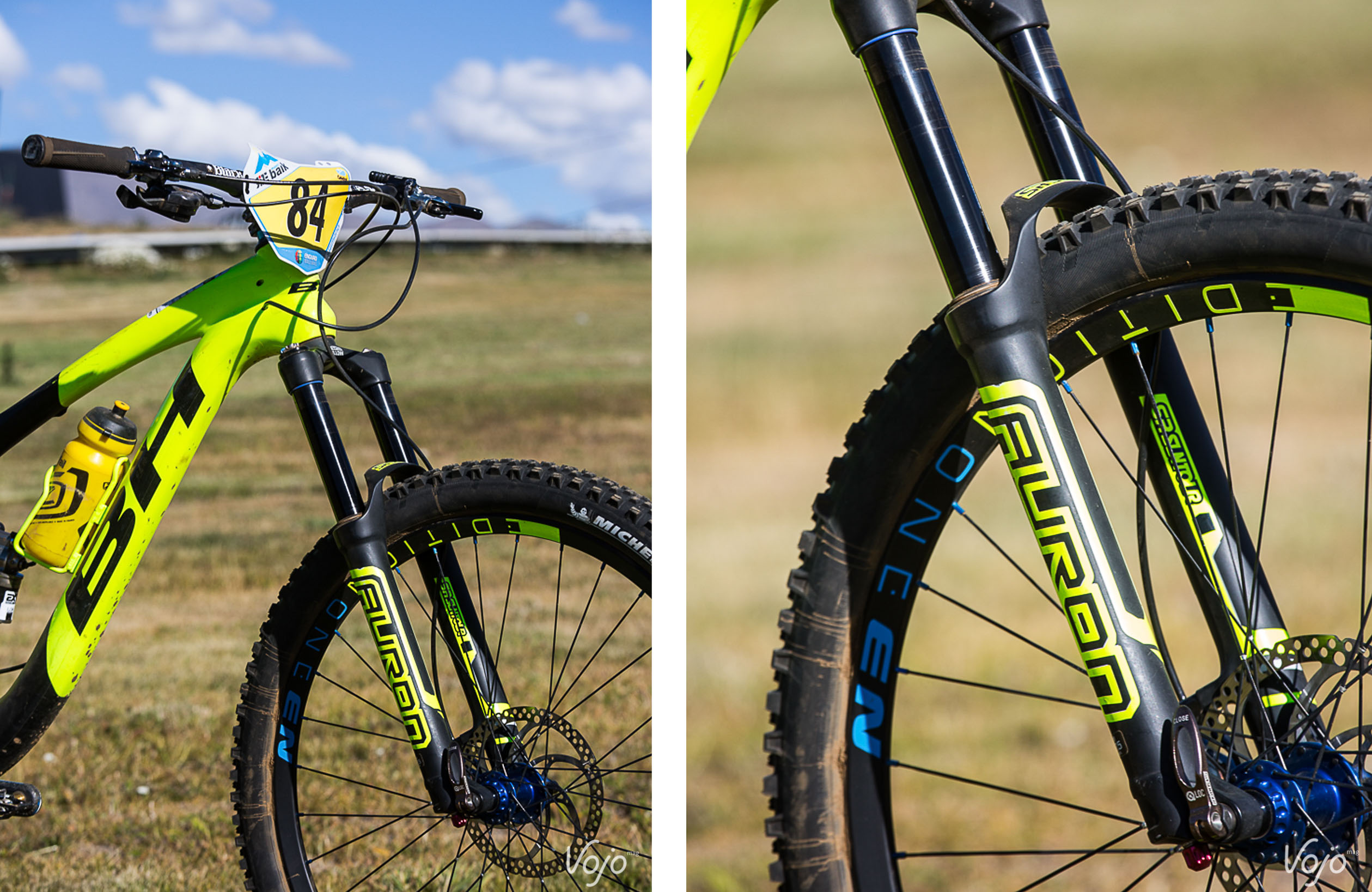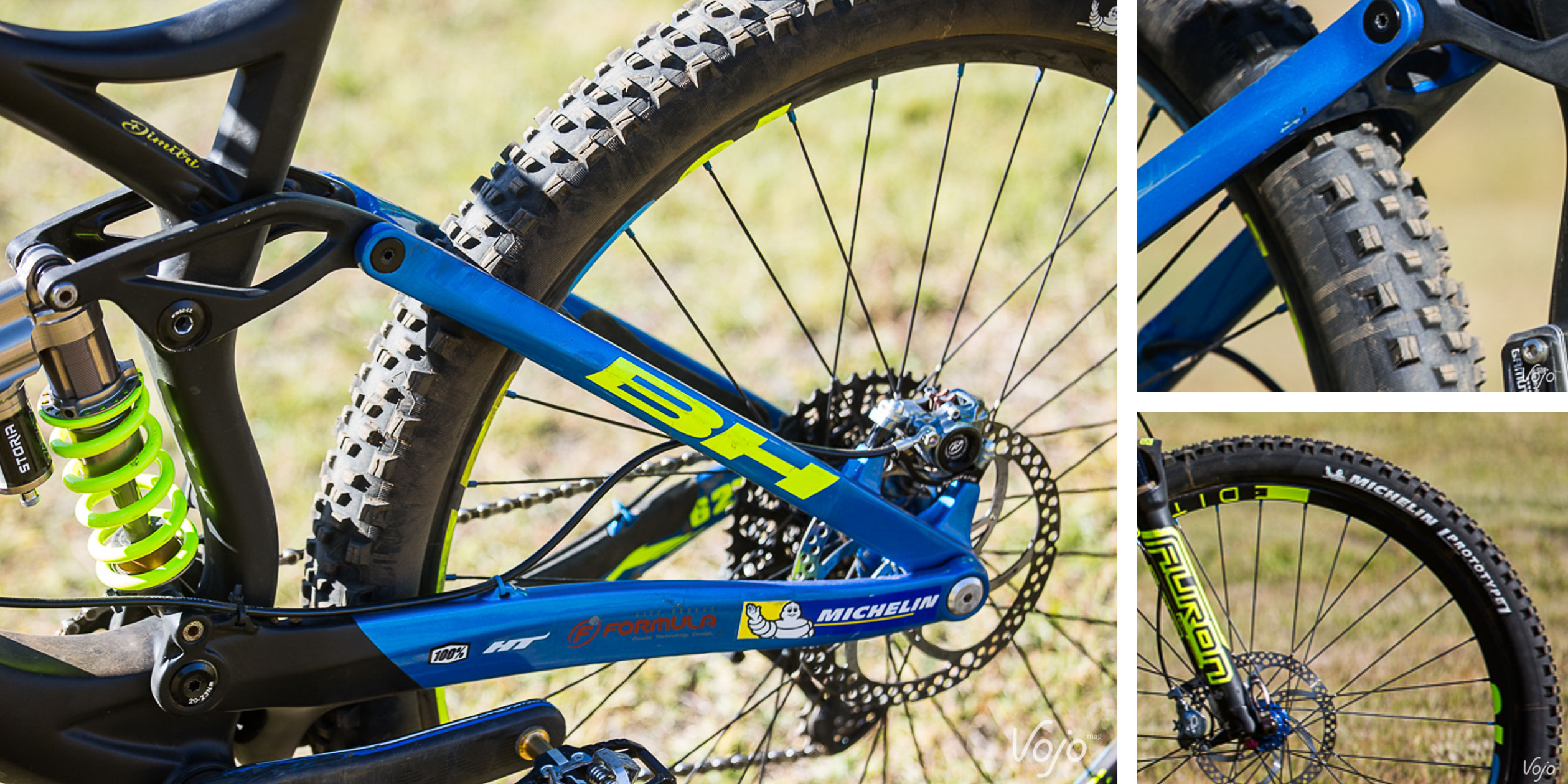 « Sur le train roulant, j’ai la nouvelle jante Sram Roam 60 carbone en 30mm de large à l’avant avec un pneu Michelin Grip’r bi-gomme proto. Derrière je reste sur une petite jante alu en 21mm de large, la Roam 50 de chez Sram avec un pneu Michelin Race’r Enduro Rear normal, de série ». Les pédales sont des HT et la tige de selle est la nouvelle Reverb en 125mm de débattement.