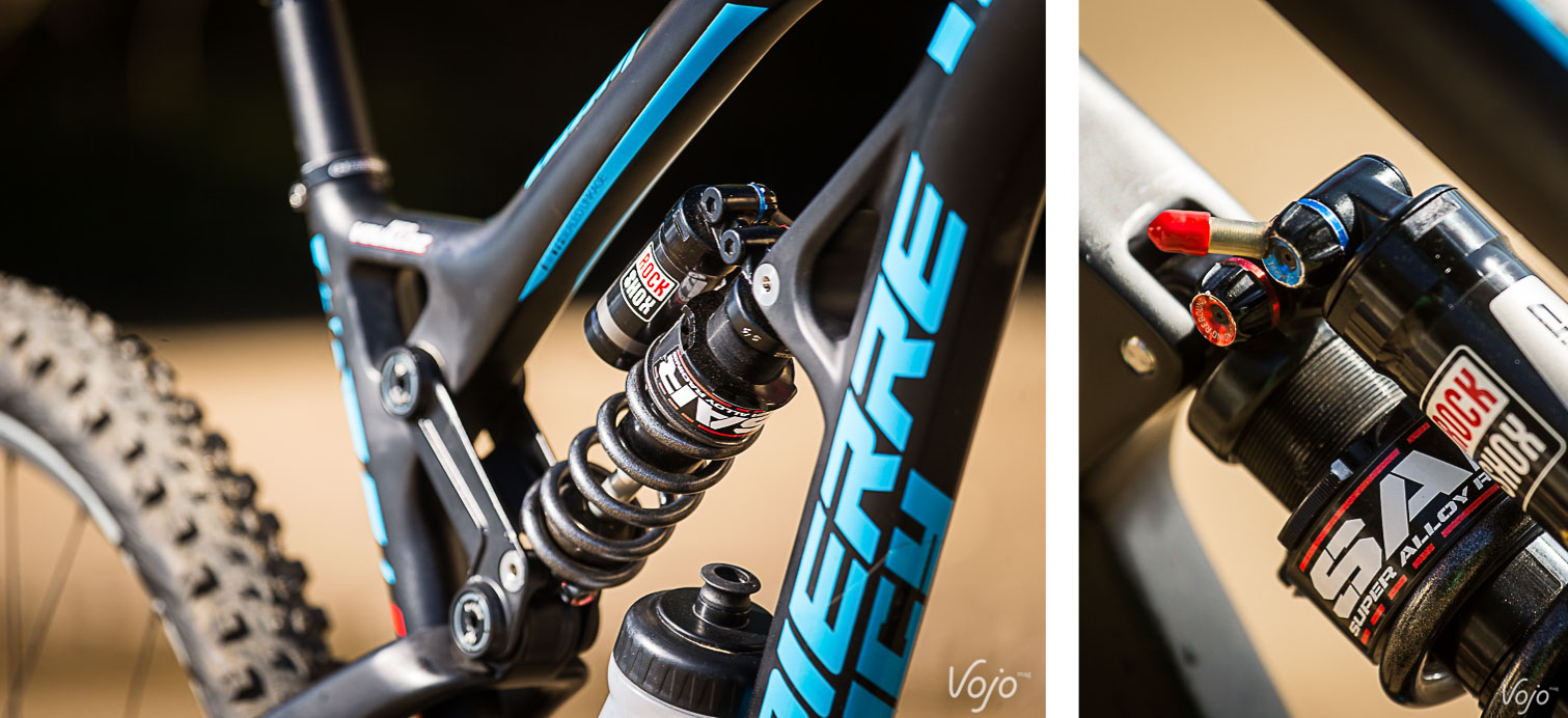 La fourche est une Sr Suntour DuroLux, qu’on peut aussi voir sur le Scott de Remy Absalon. Elle est équipée de la nouvelle cartouche R2C2 permettant de régler la compression et la détente sur les hautes et basses vitesses. La pression est de 60psi avec un token.