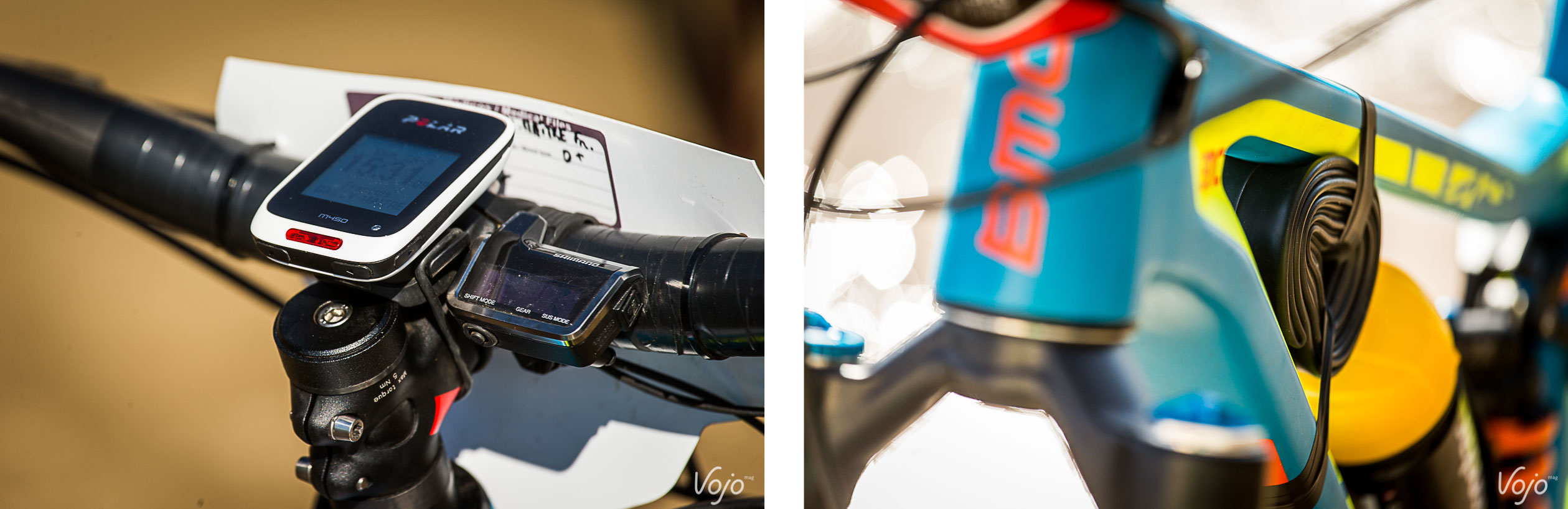 En course, FBM ne se sépare pas de son Polar et il place une chambre à air près de la douille de direction de son vélo.
