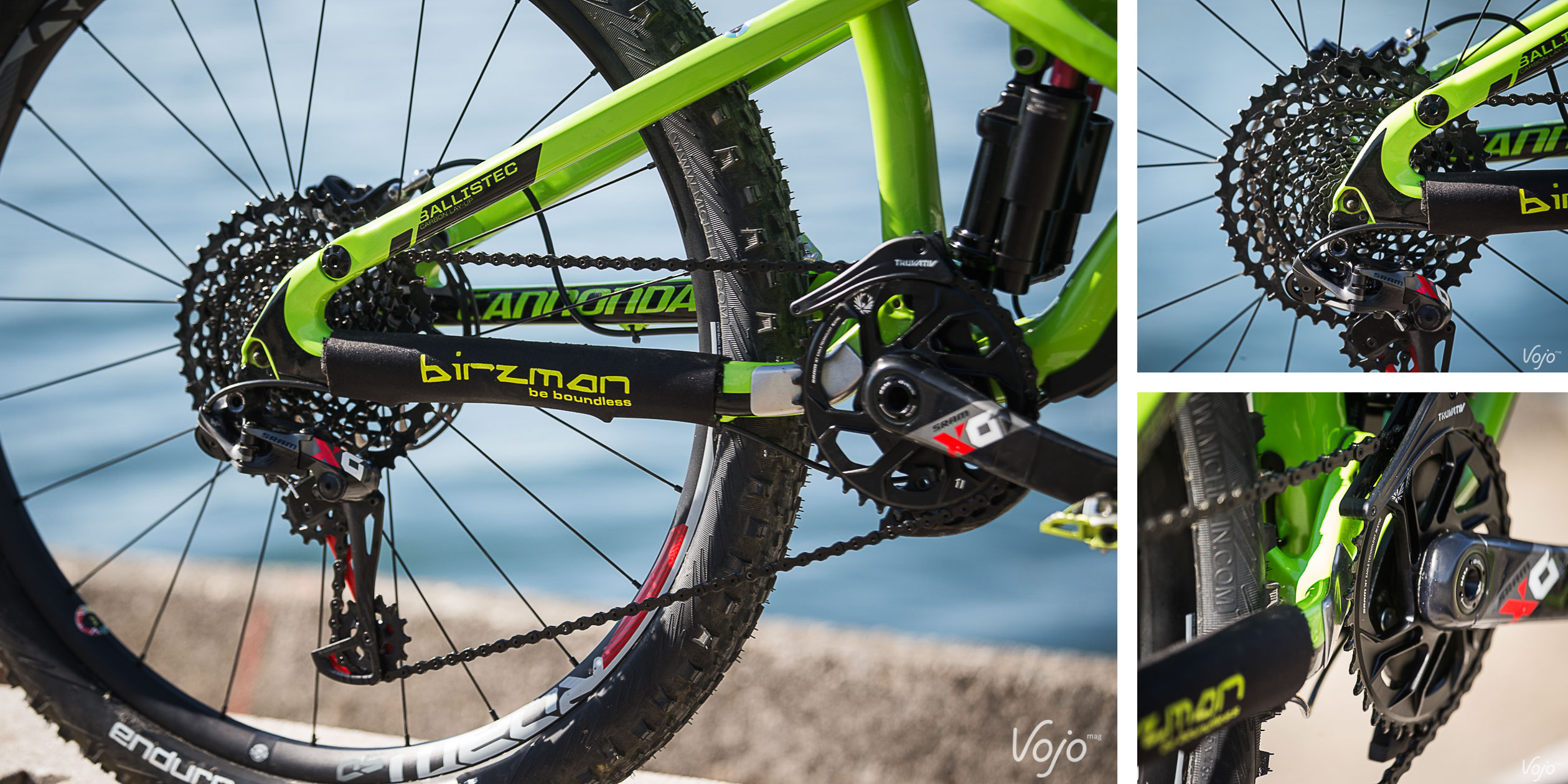 La transmission est en Sram XX1 avec renfort au niveau de la patte de dérailleur, les pédales sont des HT avec axe titane, la chaîne provient de chez Taya.