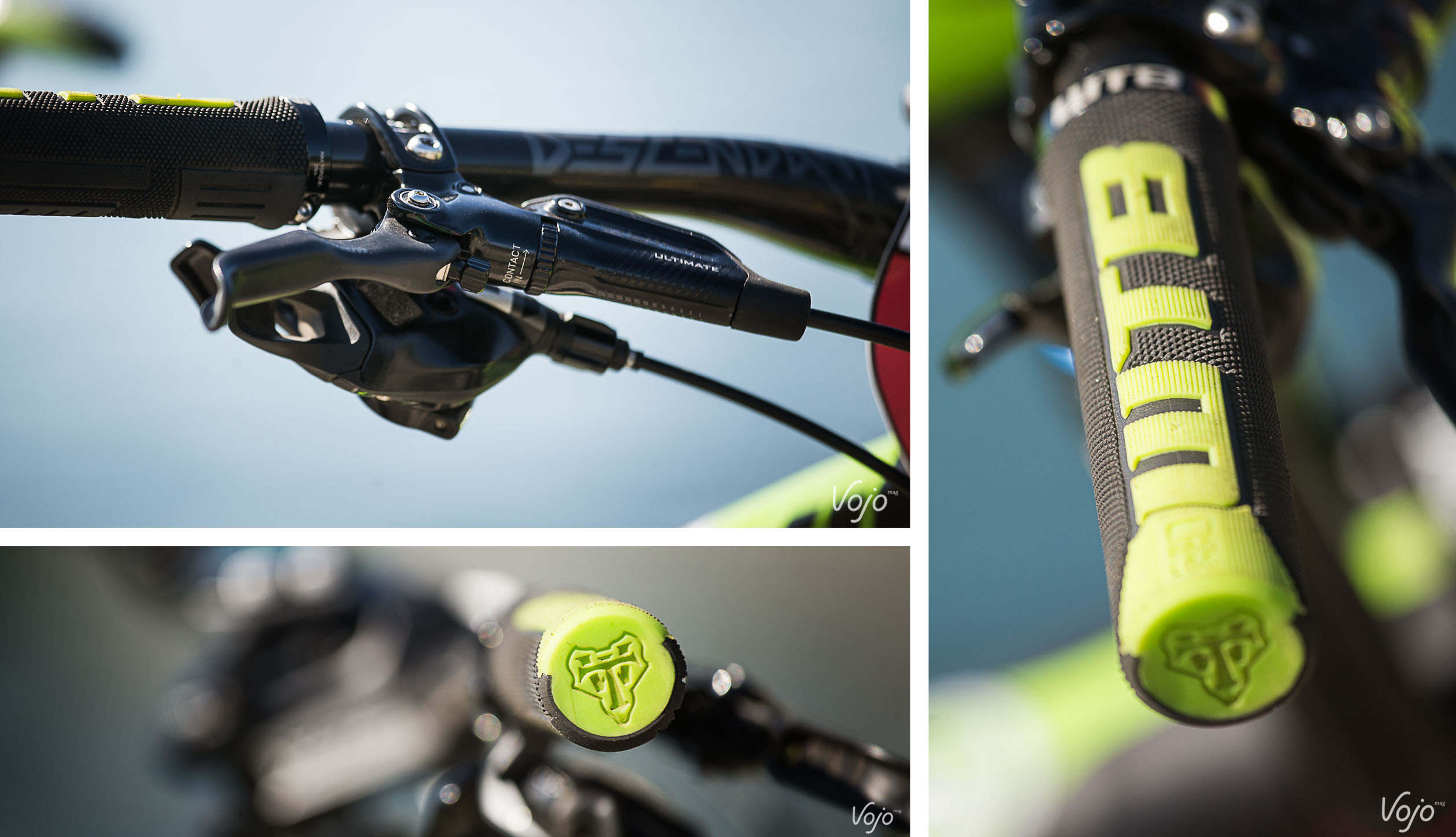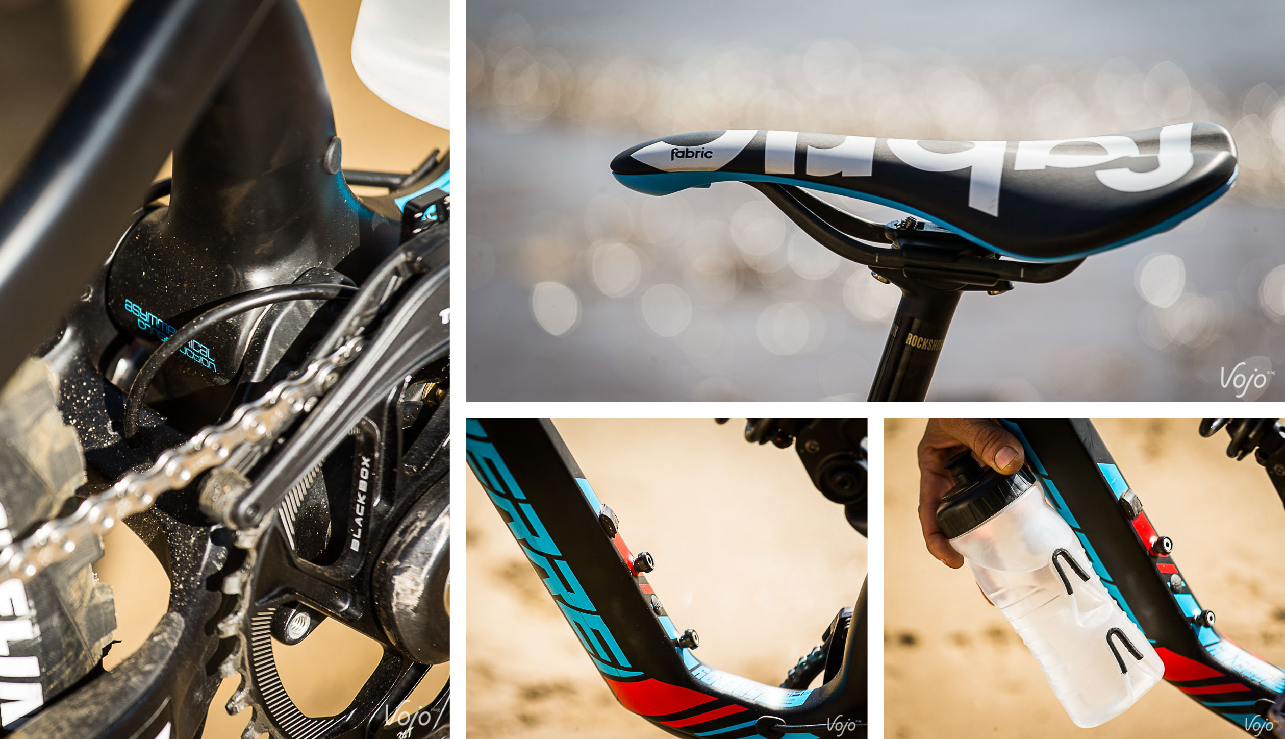 Les composants viennent de chez Funn : « Le cintre est un modèle Black Ace carbone en 780mm et la potence FunnDuro, qui est sans doute un des meilleurs rapports poids/prix du marché (123g pour moins de 50€), est en 45mm. » La selle provient aussi de la même marque et elle est montée sur une tige de selle RockShox Reverb. Les freins sont des Formula RO avec disques de 180mm