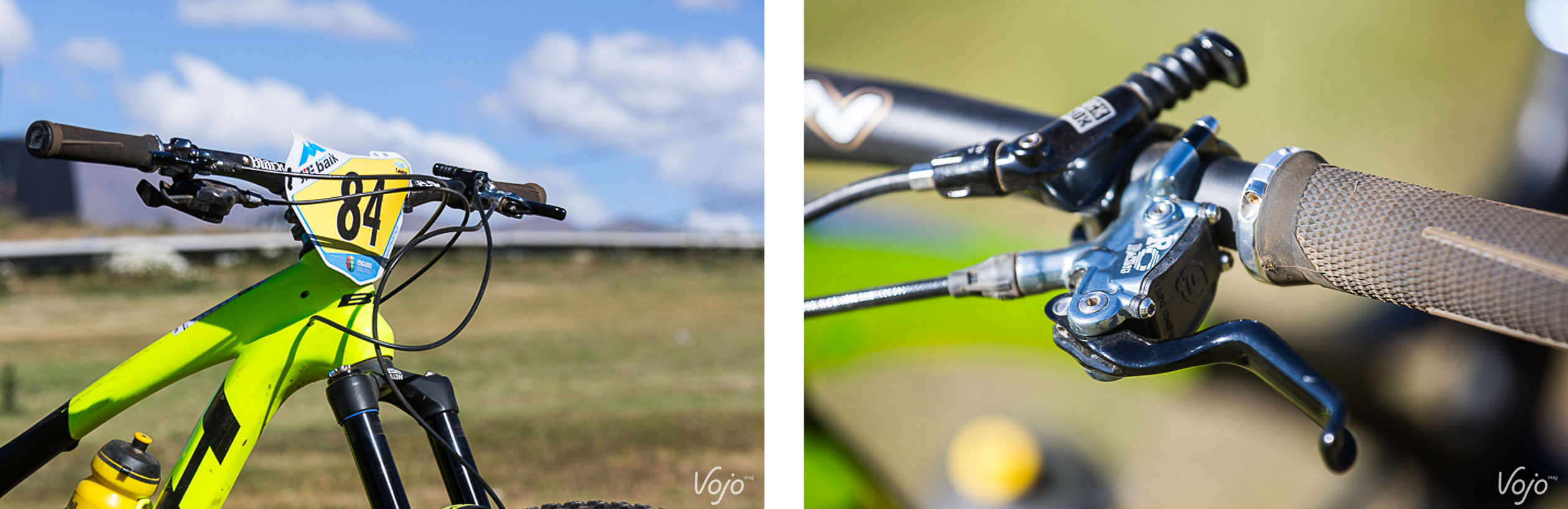Son amortisseur est aussi customisé : « Il est doté d’un ressort léger Stendec et je me suis fait un petit levier custom pour pouvoir durcir la compression dans les liaisons. Parfois, s’il y a un long plat en spéciale il m’arrive de l’actionner mais c’est assez rare, j’essaie de ne pas trop y toucher dans les portions chronométrées. Je n’ai pas de Ei:Shock (le système de blocage électronique de Lapierre) donc je dois lâcher le guidon si je veux bloquer, ce qui est à éviter. » La fourche est une RockShox Lyrik en 170mm de débattement, entièrement de série.