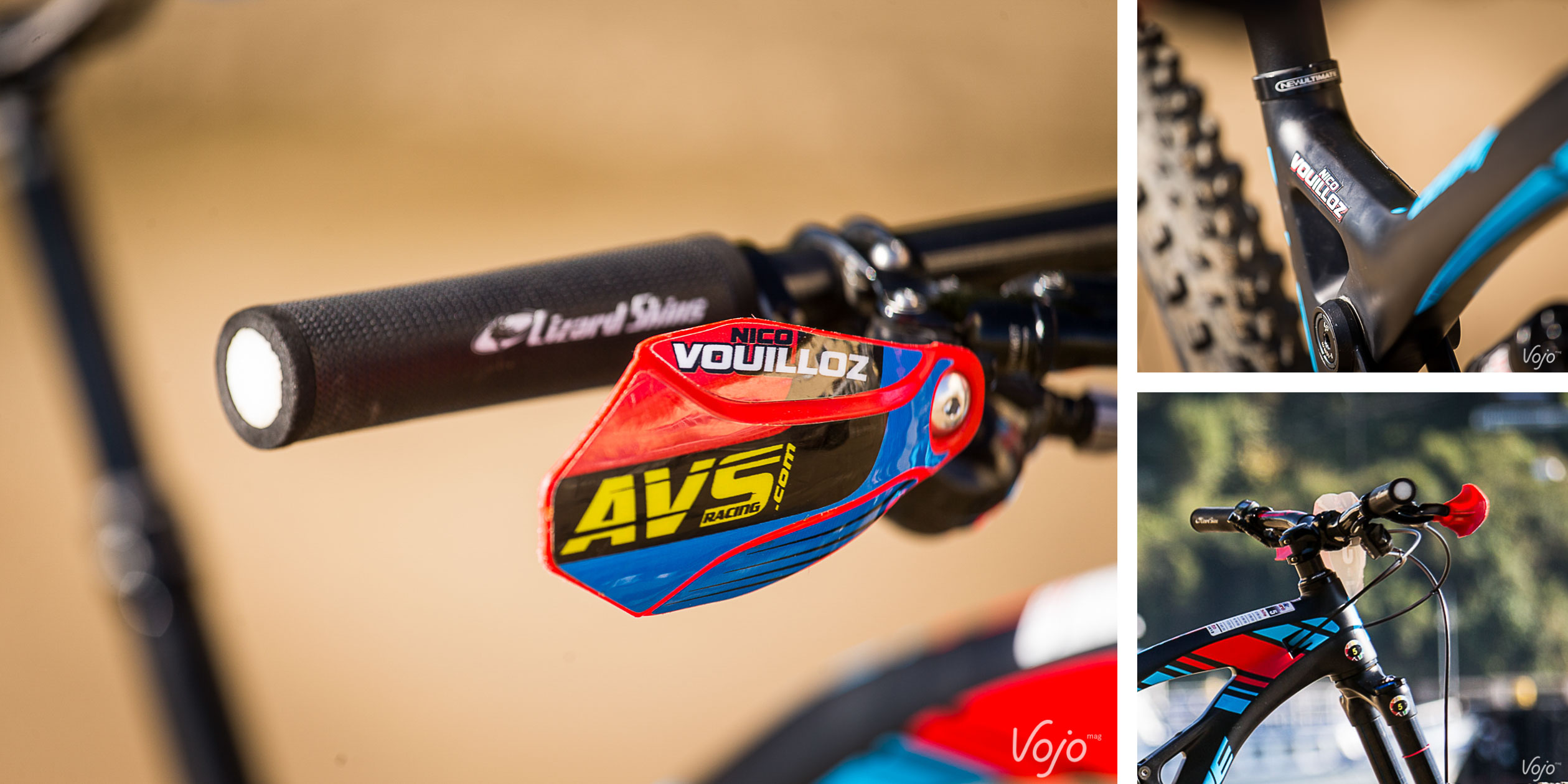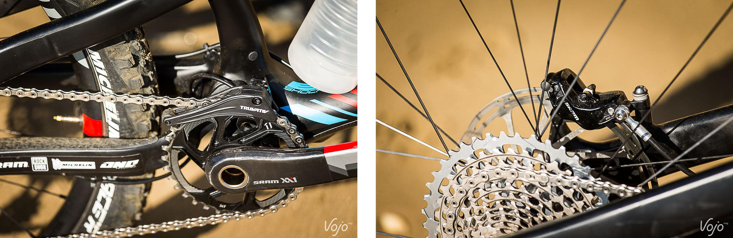 Nicolas Vouilloz est sponsorisé par Sram : « Pour la transmission je roule en Sram XX1 avec plateau de 34 à l’avant. J’ajoute un anti-déraillement Sram pour être sûr. » Pour l’instant, Nico est resté en 11 vitesses, y compris pour l’Irlande où il s’est monté un vélo quasiment identique mais avec une nouvelle déco. Les freins, sont des Guide Ultimate en disques de 180mm avant et arrière.