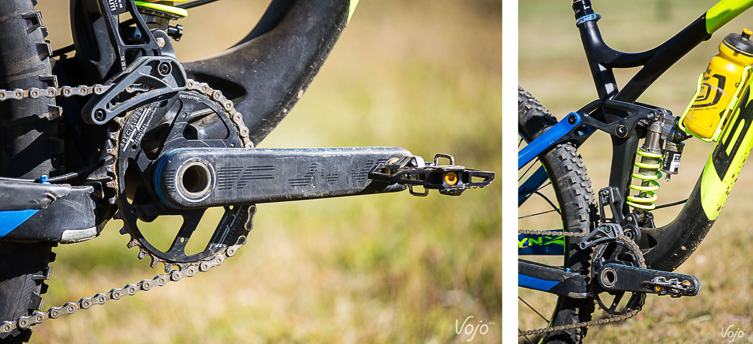 Plus rare, le pédaler est également un Funn carbone en 170mm de long. Il est équipé du tout nouveau plateau Ovalution 34 dents de chez Specialized TA, dont la forme très travaillée, ni circulaire, ni ovale, vise à réduire le point mort au pédalage. Il peut recevoir en option l’Enduro Bow, sorte de petit boomerang qui sert de renfort en utilisation enduro. Karim Amour l’utilise, mais pas Dimitri Tordo sur ce montage. L’anti-déraillement de chez Gamut
