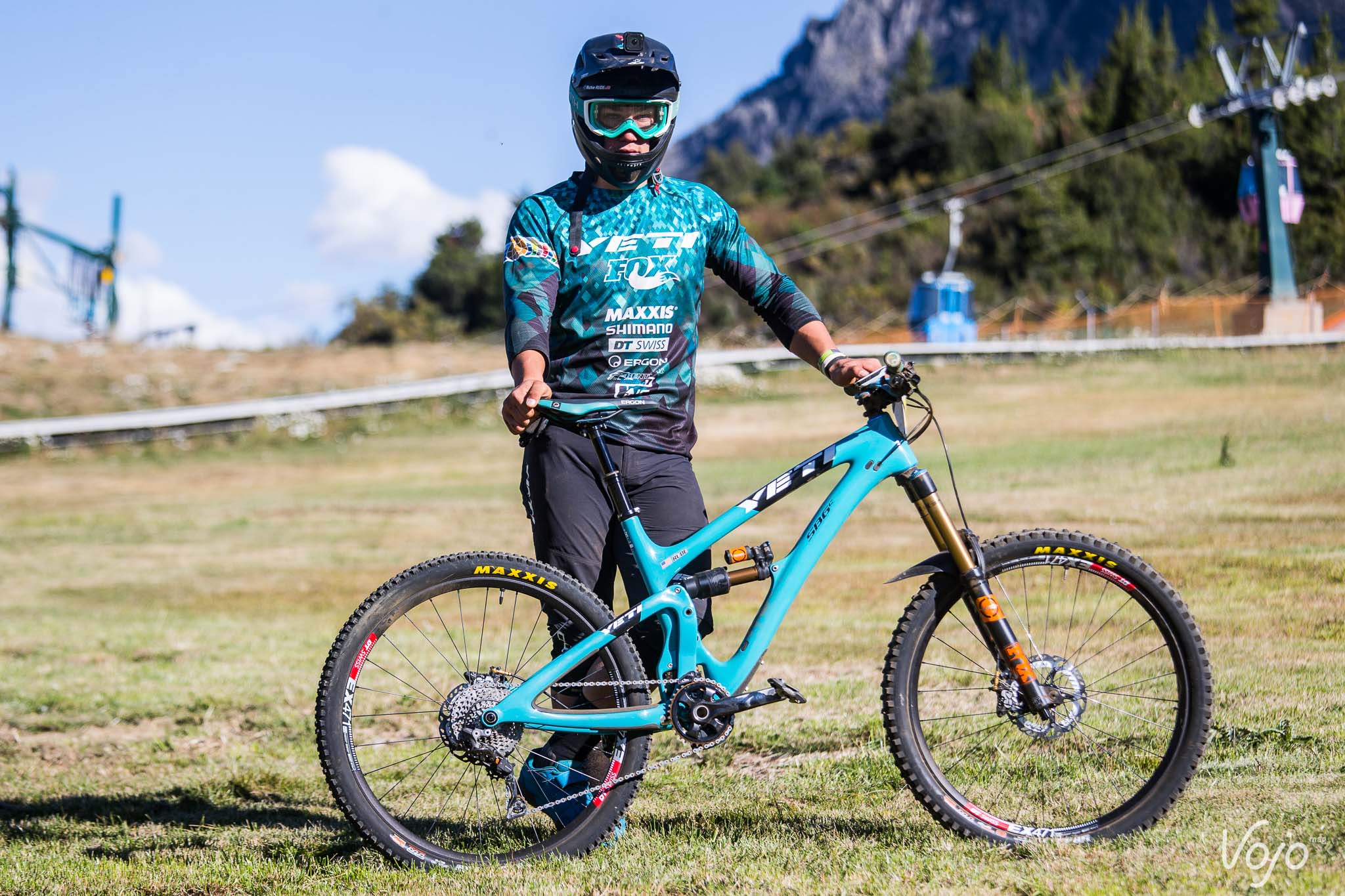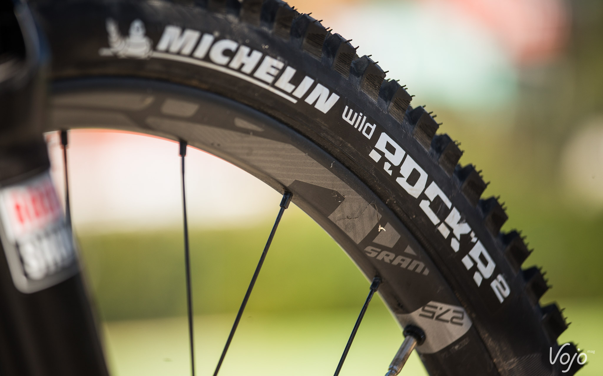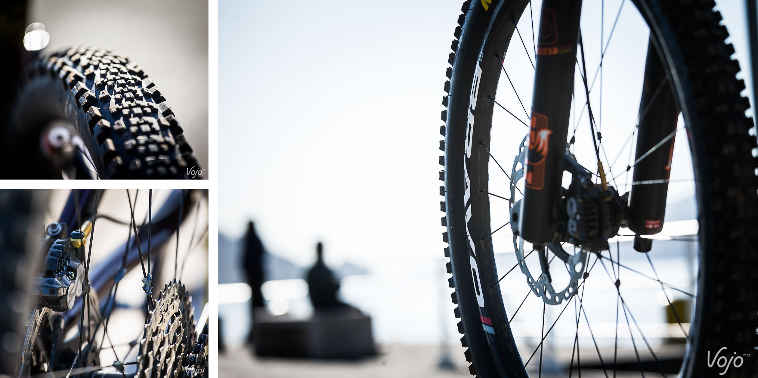 « Du côté des trains roulants, j’utilise la nouvelle Sram Roam 60 carbone, 30mm de large à l’avant et à l’arrière une Roam 50 en aluminium. Un couple qu’on retrouve également chez Nicolas Vouilloz. « En pneus, j’ai choisi le Rock’R2 en gomme Magi’x à l’avant et le nouvel Enduro Race’r Rear en Gum’x à l’arrière. Au niveau des pressions, je roule à 1,35 bar à l’avant et 1,65 à l’arrière. »