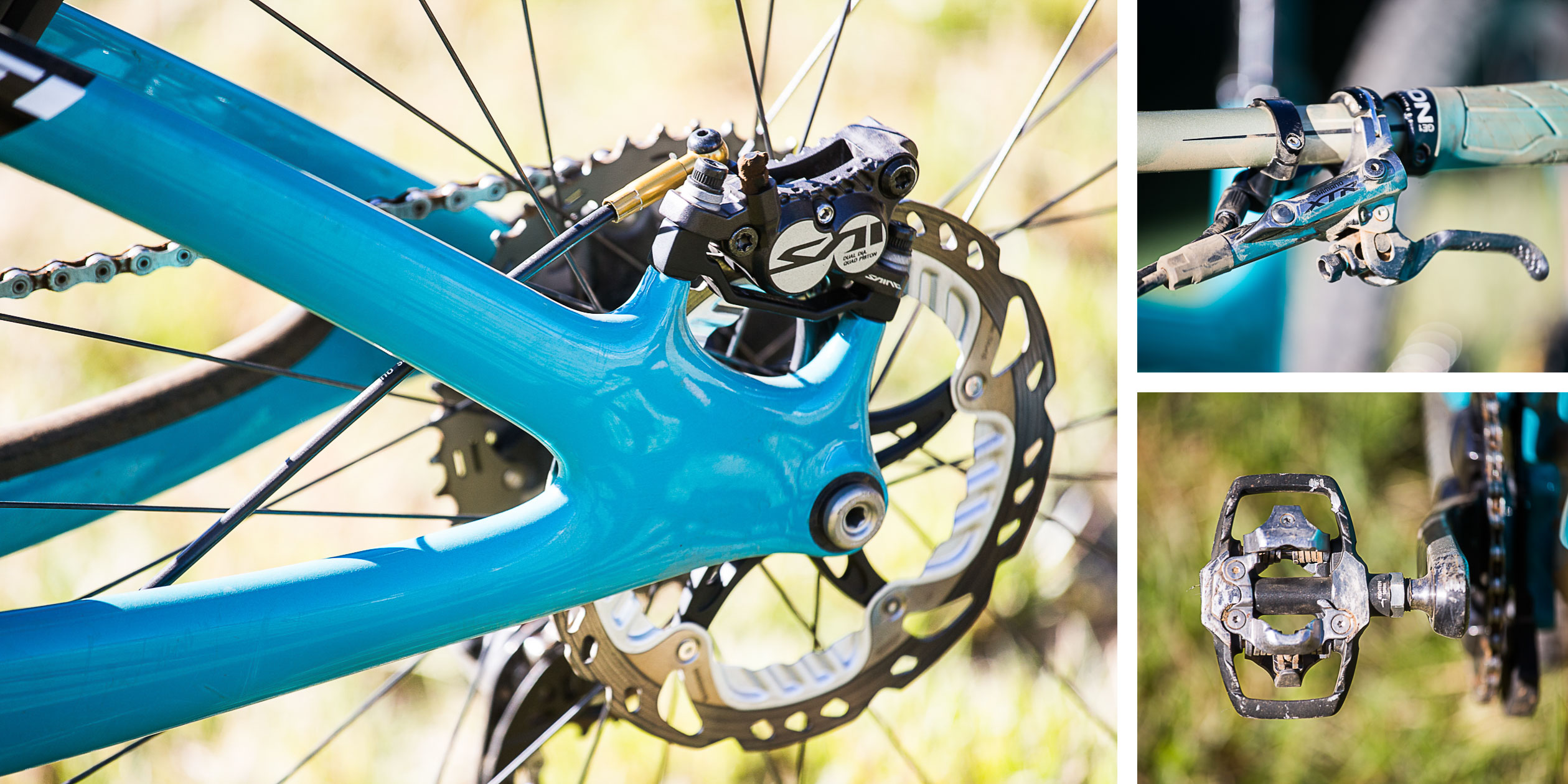 Richie Rude roule en full Shimano sur son Yeti SB6c, tant pour la transmission XTR (en version mécanique avec plateau 34 ou 36 dents selon le tracé et anti-déraillement One-Up), que pour les pédales et les freins. Sur ce dernier point, il mixe des poignées XTR Trail avec levier en carbone, plus légères, et des étriers 4 pistons Saint pour plus de puissance et de constance. Il n’utilise par contre pas les plaquettes dotées de petits radiateurs de refroidissement. Les disques sont en 180mm de diamètre.