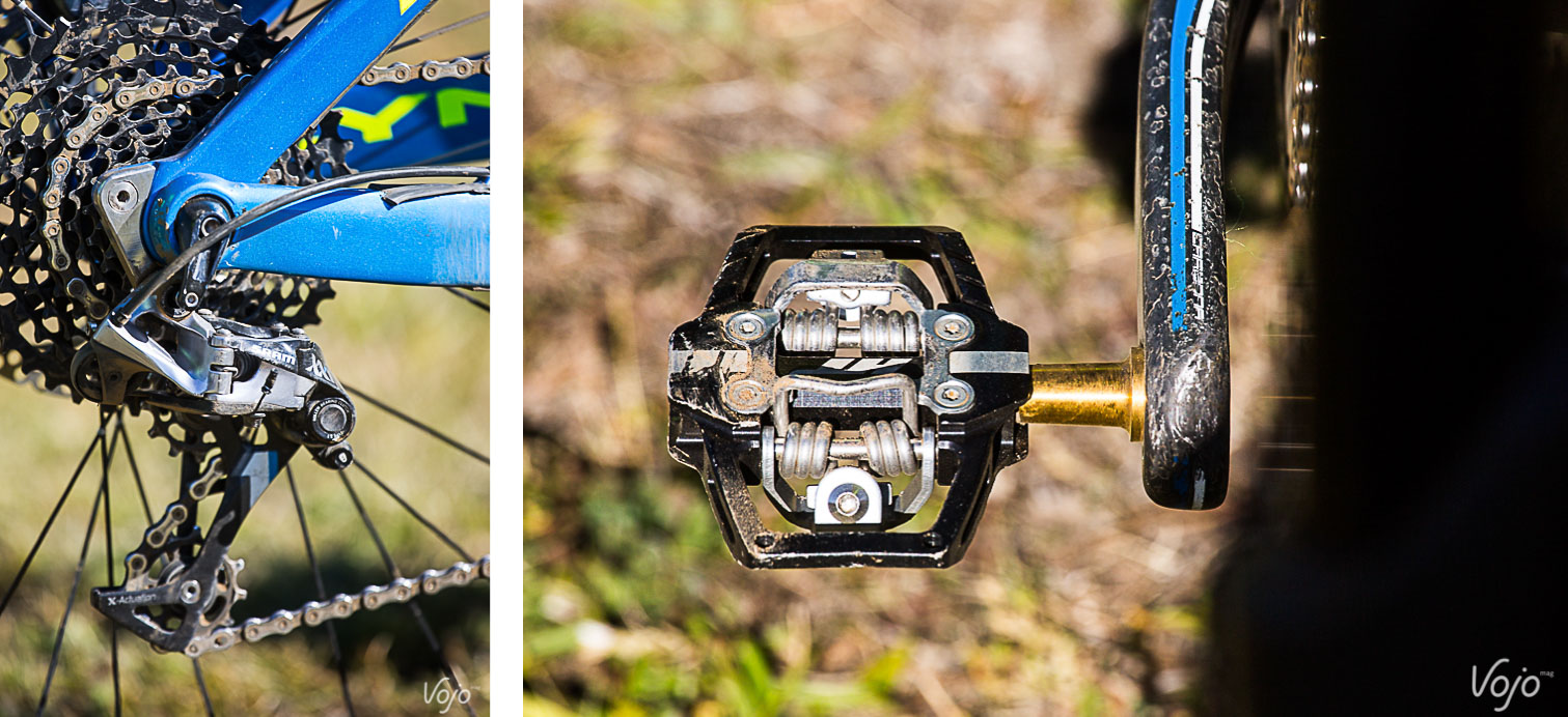Après être resté longtemps sans sponsor pour les pédales (il roulait avec des Shimano XTR qu’il achetait lui-même) car il ne trouvait rien qui lui convenait, Jey roule désormais en HT. Jérôme roule aussi avec un Mucky-Nutz à l’avant, pour la boue mais aussi pour les projections de cailloux quand il fait sec. Pour la tige de selle, la nouvelle RockShox Reverb en 125mm est montée avec la selle WTB Silverado.