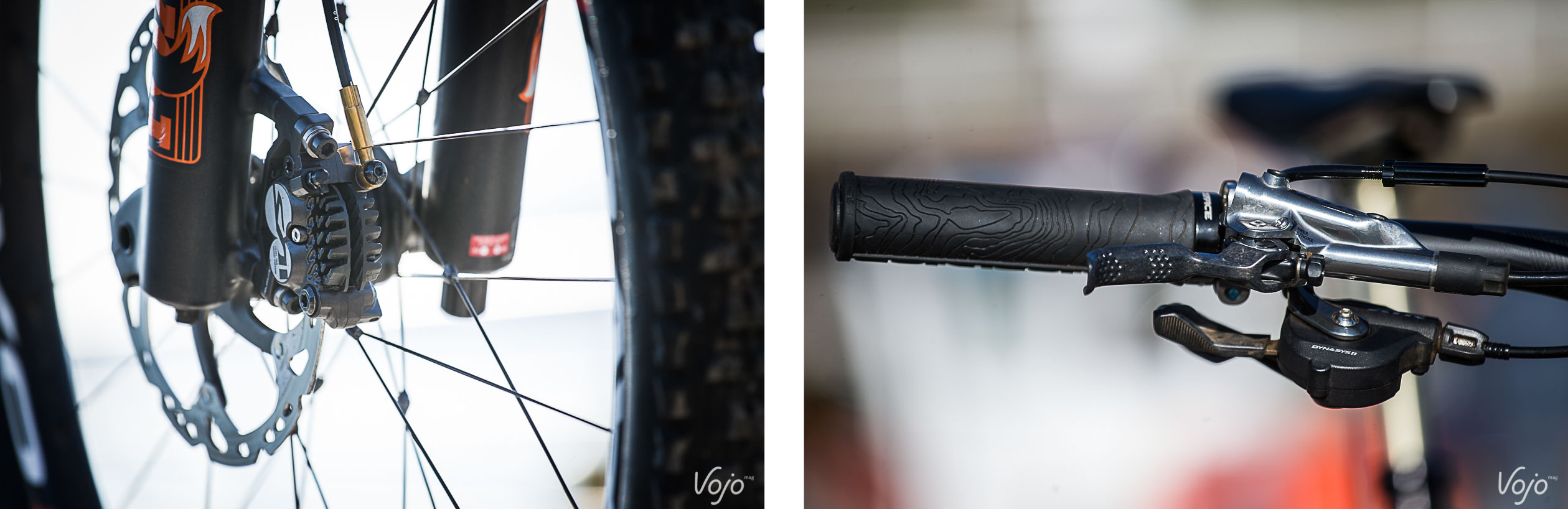 Comme Richie Rude notamment, Florian Nicolaï mixe des leviers Shimano XTR Trail et des étriers Saint. Les disques sont en 203mm.