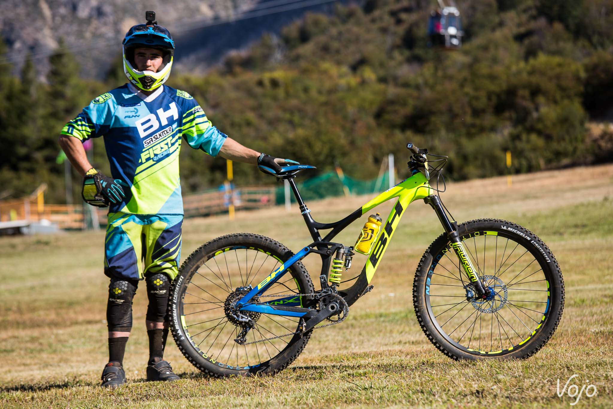 Au niveau des liaisons au sol, si les pilotes BH roulent aussi avec les Michelin Grip’r 2 à l’avant (gonflé à 1,5 bar) et Enduro Rear à l’arrière (1,8 bar), le vélo de Dimitri Tordo est ici équipé de prototypes avec un tout nouveau dessin intermédiaire.