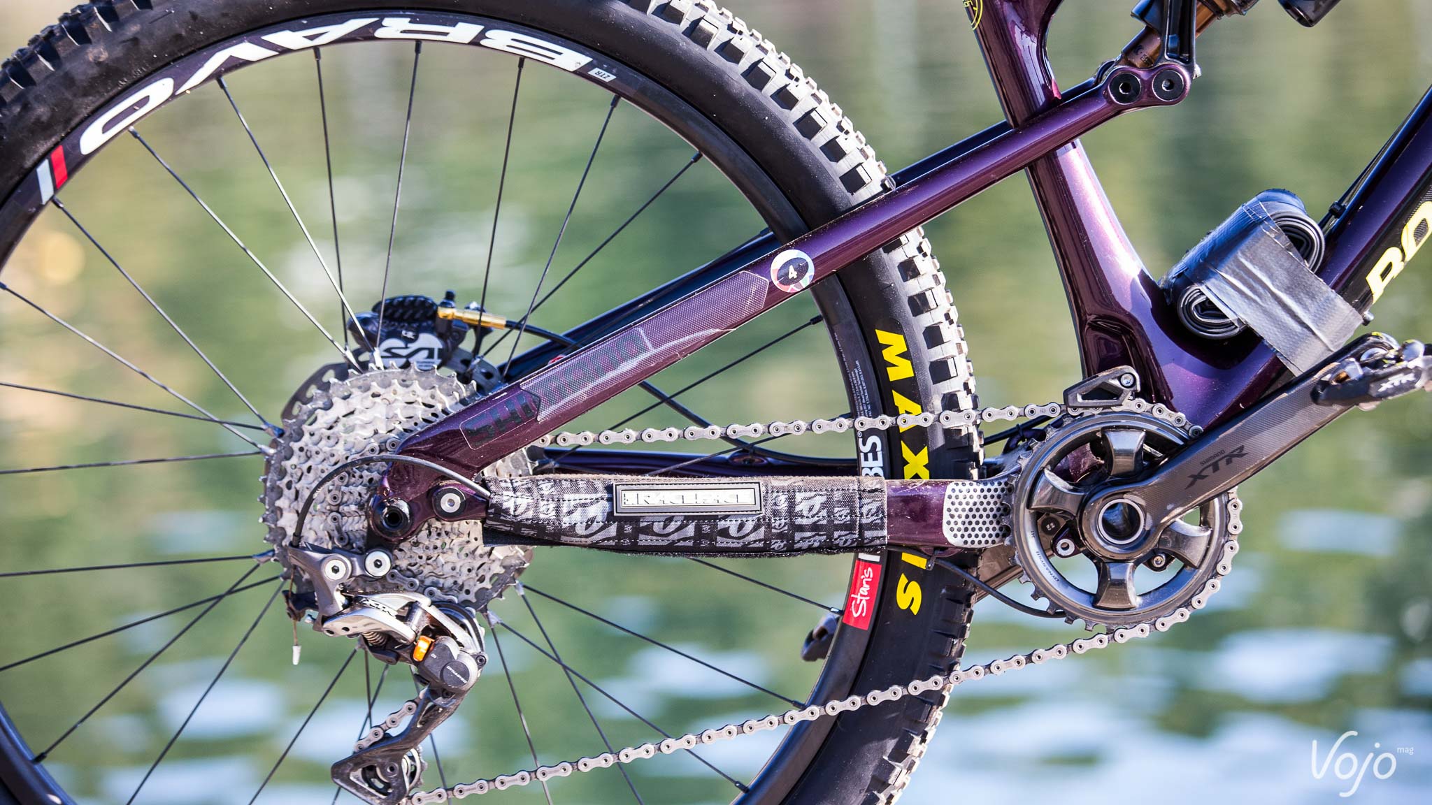 Jérôme Clementz est un des premiers pilotes à avoir reçu le Sram Eagle XO 12 vitesses, qu’il a déjà utilisé sur les deux premières manches de la saison. Pour l’anecdote, il est parti en pleine confiance avec ce groupe pour lequel il a aussi contribué au développement, dans la mesure où il ne disposait d’aucune pièce de rechange, si ce n’est un maillon rapide. Et c’est passé, sans souci. Le passage au 12 vitesses lui permet de rouler avec un énorme plateau de 38 dents à l’avant, sans pour autant que cela devienne inroulable dans les liaisons. Un guide chaîne Truvativ vient sécuriser la tenue de la chaîne.