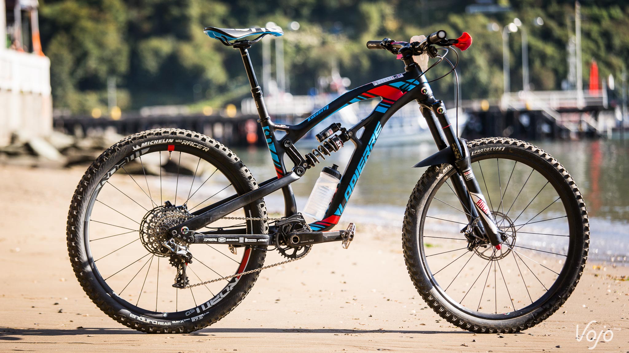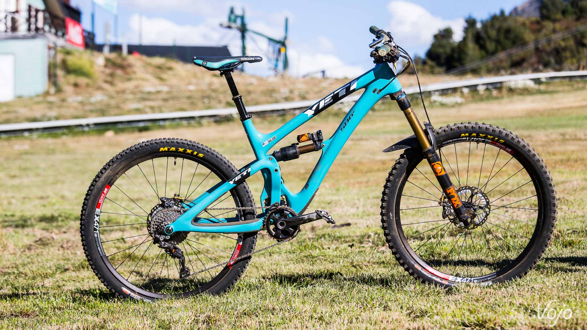 Après avoir un moment roulé avec le SB5c en 130mm, Richie Rude a conquis l’an dernier son titre de champion du Monde 2015 au guidon du Yeti SB6c en 155mm de débattement. Le cadre est entièrement de série… mais pas vraiment les suspensions. A l’avant, la Fox 36 RC2 est passée en 170mm de débattement pour, selon Richie « avoir un peu de réserve et surtout, pour coucher un peu plus l’angle de direction. »