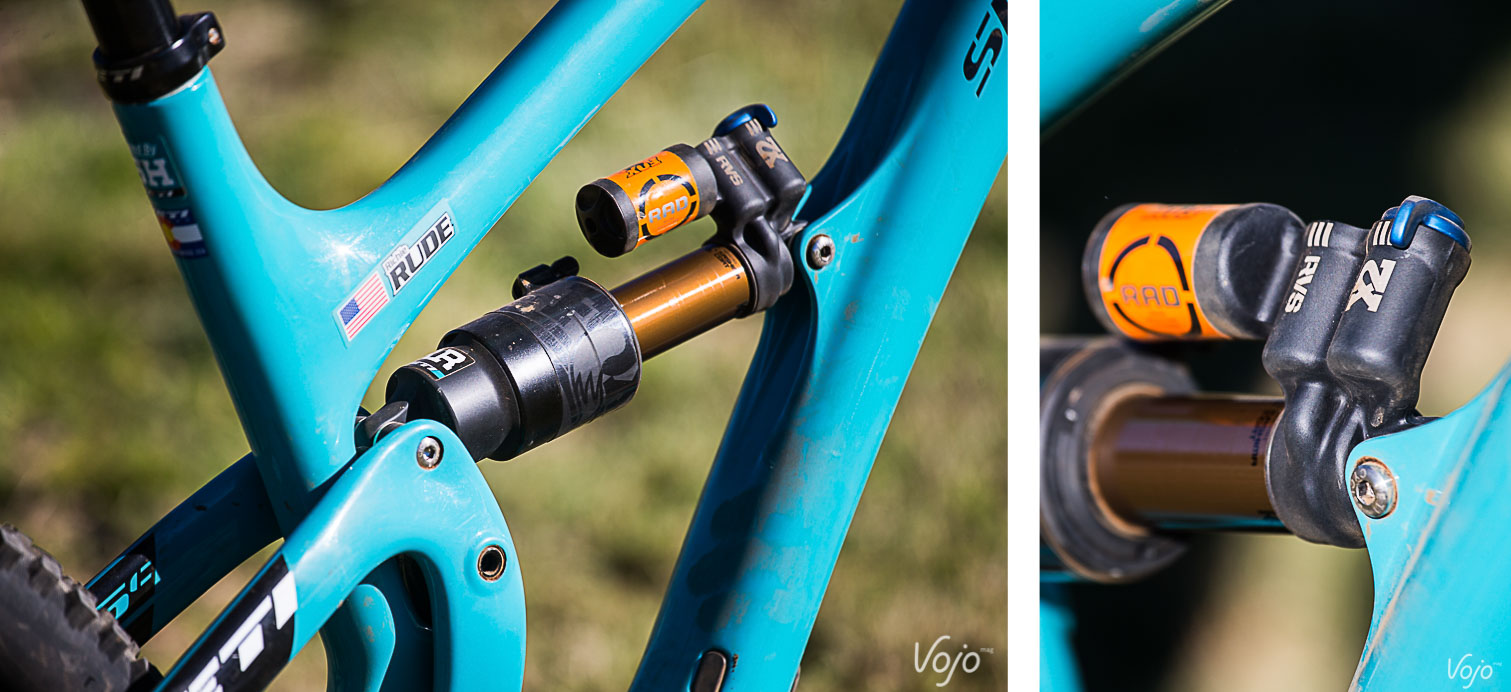 Pensé à l’origine pour la descente, le Fox Float X2 offre des possibilités de réglages très fines à haute et basse vitesses, tant pour le rebond que pour la compression. Il s’agit ici de la toute nouvelle version 2 Position Lever, présentée cette année, et qui se destine plus à l’enduro avec un petit levier permettant de durcir la compression d’un tour de main pour les liaisons. L’autocollant RAD indique que Rude fait partie du programme de développement usine de Fox.