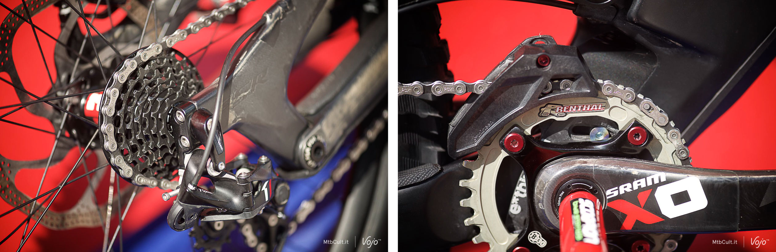 Aaron Gwin n’a donc pas vraiment utilisé sa transmission Sram XO1 DH, ses 7 vitesses et sa couronne Renthal 34 dents. Petit détail intéressant : il utilise des manivelles de 165mm de long seulement. Notez également le renfort au niveau de la vis de fixation du dérailleur arrière.