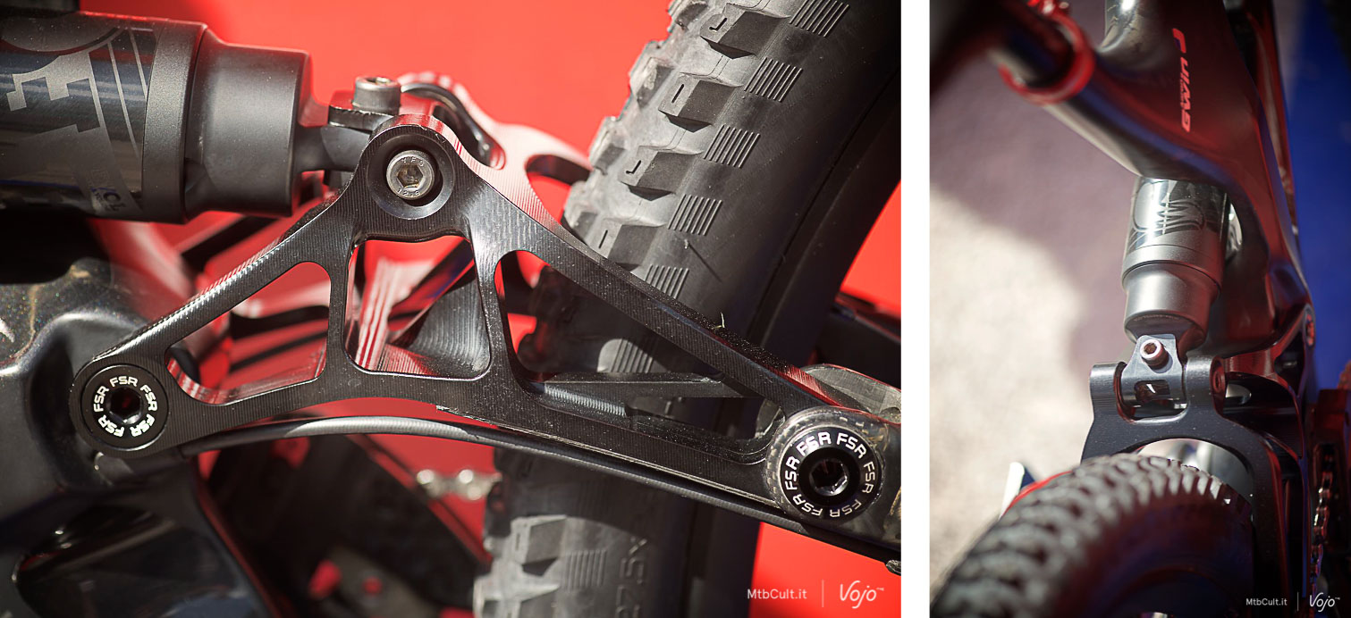… Mais là où le vélo d’Aaron Gwin est différent de la série, c’est au niveau de la biellette, comme celui de son coéquipier Troy Brosnan d’ailleurs. Celle-ci est en aluminium usiné. Son poids s’approche de la biellette carbone du modèle de série, mais l’avantage est ailleurs : elle permet non seulement d’ajuster légèrement la hauteur du boîtier de pédalier (+/- 6mm) mais elle offre surtout un comportement de suspension adapté de façon plus fine aux demandes des pilotes de Coupe du Monde, c’est à dire avec une courbe plus progressive et une gestion de la compression en fin de course plus ferme et plus adaptée au pilotage des deux champions, sans qu’ils doivent modifier la compression au niveau de l’amortisseur. Rien n’indique que cette pièce débouchera sur une version de série car elle est destinée à rencontrer des besoins bien spécifiques et assez éloignés de ceux de pilotes amateurs, même très doués.