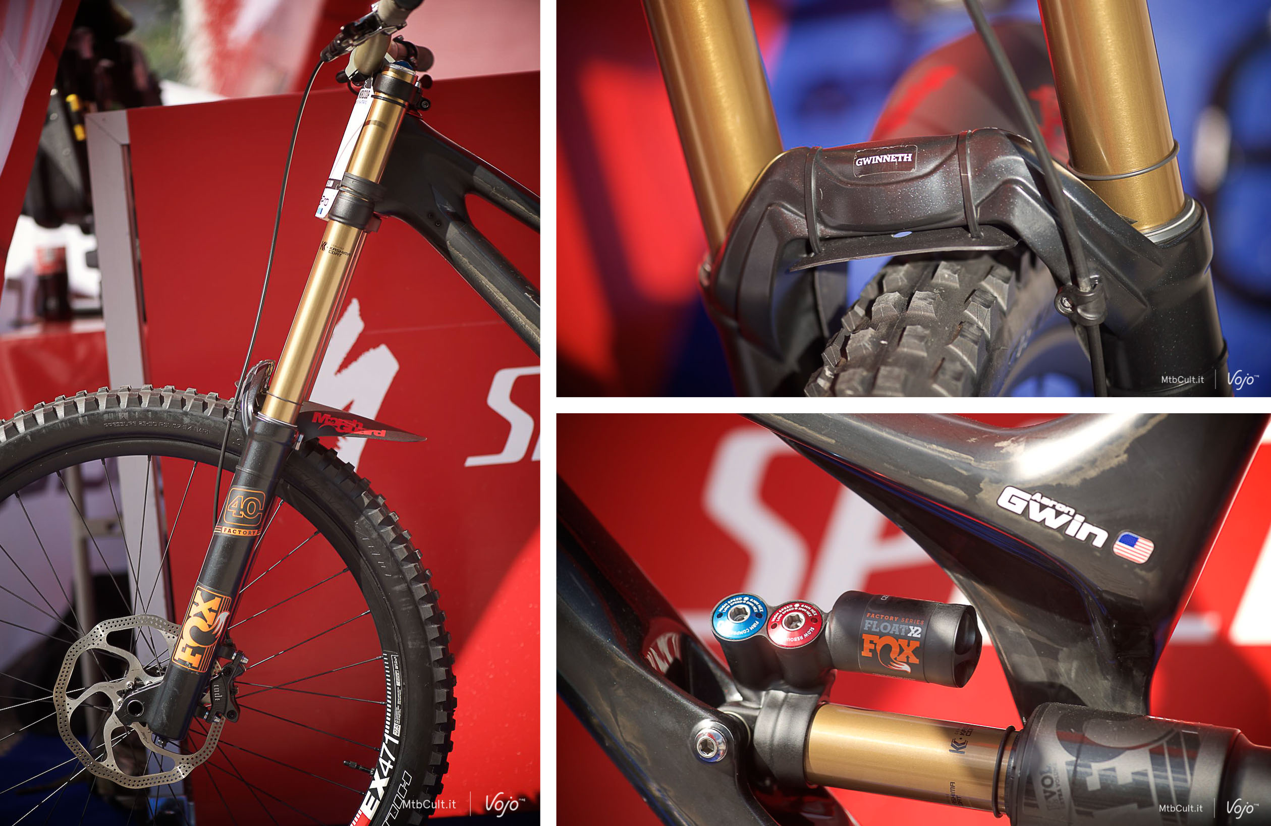 Pour ce qui est de l’amortissement justement, Aaron Gwin roule avec une Fox 40 à l’avant et le tout nouvel amortisseur Fox Float X2 qui dispose d’un réglage de compression et du rebond à haute et basse vitesse. Pour plus de détails, voyez notre article consacré aux nouveautés Fox 2016. Les réglages de « Gwinneth » sont par contre tenus secrets…