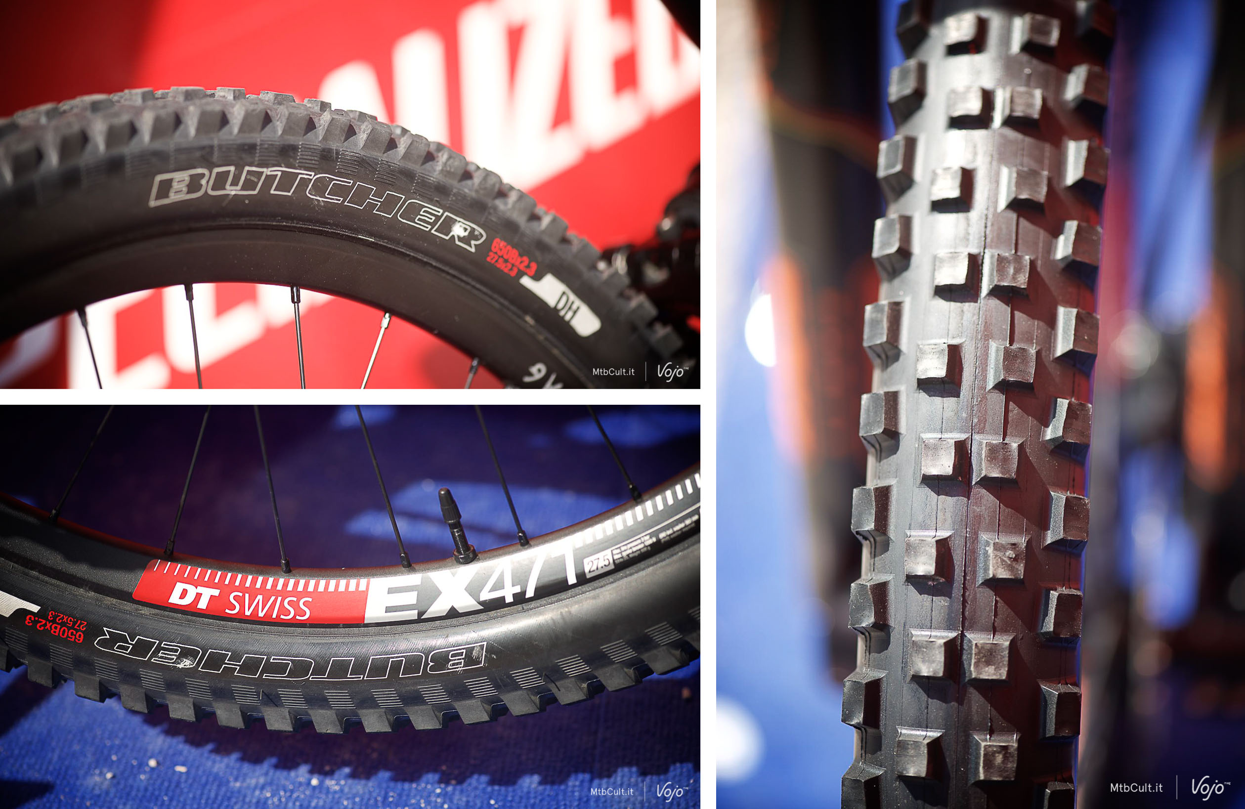 Au niveau des pneus, Aaron Gwin utilisait un Specialized Butcher à l’arrière, couplé à une version prototype du HillBilly, dont les crampons ont été retaillés et sont disposés différemment de la version de série.