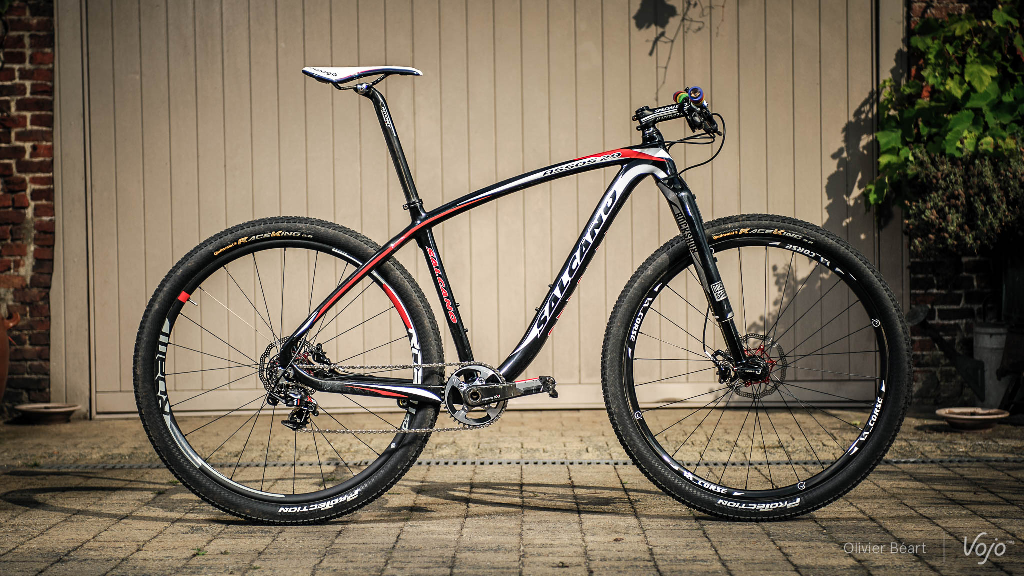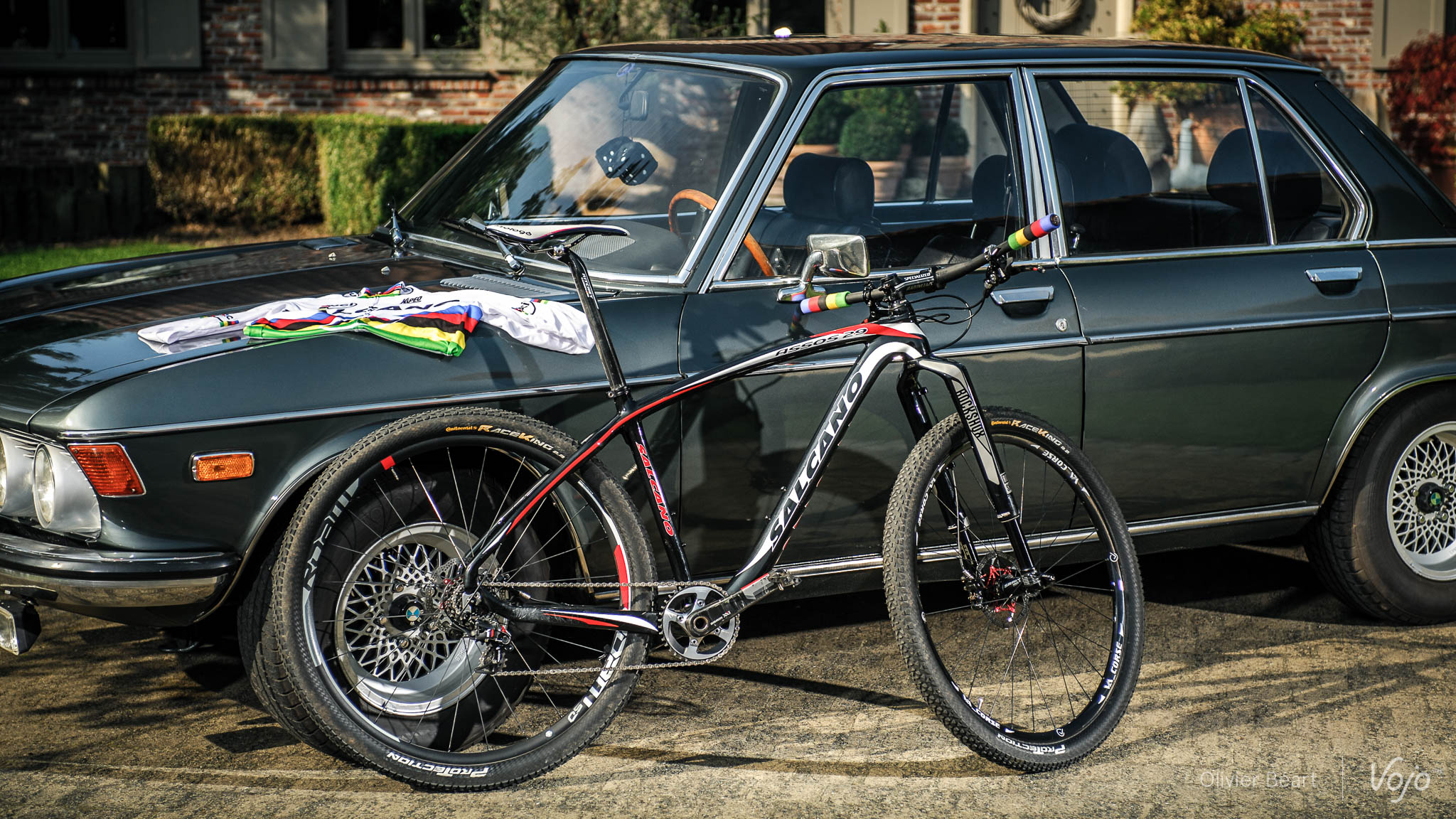 Fabrice Mels, le tout nouveau champion du Monde de XC-Eliminator, nous a reçus chez lui, à Sinaai en Flandre Orientale, pour une interview exclusive que vous pouvez retrouver ici : mag.vojomag.com/interview-mels Au-delà de son incroyable course aux championnats du Monde de Hafjell, de sa passion pour le Dirt qu’il pratique régulièrement et de son amour des voitures de collection (de préférence allemandes des années 60 et 70 !), « Mister Eliminator » nous a présenté le vélo avec lequel il a tout gagné cette année (Champion du Monde, de Belgique et vainqueur de la Coupe du Monde). Suivez le guide pour découvrir cette machine atypique, optimisée pour supporter les efforts intenses et brefs du XCE… ainsi que la puissance de ce colosse de 2 mètres. Pour commencer, Fabrice ne connaît pas le poids de son vélo ! C’est tellement inhabituel de la part d’un crosseur, que nous n’avons pas pensé à emporter notre balance avec nous lors de cette rencontre. Fabrice nous donne l’explication: « le vélo tourne autour des 10kg, ce qui est bien assez léger pour moi. Et le poids n’est pas une obsession. Cela ne doit pas en être une quand on a mon gabarit et qu’on pratique une discipline aussi « violente » que le XCE ». Au moins, les choses sont claires. Mais ce n’est pas pour cela que la machine n’est pas optimisée ! Autre avantage, la cassette comprend un anti-déraillement incorporé du côté des rayons de la roue et le dérailleur XO1 DH dispose d’un ressort plus puissant que la version XC de sorte à tendre plus la chaîne. Là aussi, pour éviter tout décrochage. On le voit à l’état des bases: le vélo souffre ! Mais le Salcano Assos a l’air de tenir le coup. Tiens, à propos, connaissez-vous la marque Salcano ? Non ? C’est normal ! Si vous habitiez en Turquie par contre, ce nom vous serait familier car il s’agit d’un des leaders du marché national. Comment Fabrice a-t-il atterri dans cette équipe ? « Mon coach est Néerlandais et entraîneur de l’équipe nationale turque. Il a donc beaucoup de contacts là-bas. Salcano recherchait un pilote de niveau international pour mieux se faire connaître. Voilà comment tout a commencé. Normalement, je roulerai encore pour eux en 2015″. En tout cas, la mission semble accomplie, puisqu’on connaît aujourd’hui (un peu) ce nom en Europe Continentale ! Même si vous n’en trouverez nulle part en Belgique, mis à part dans le garage de Fabrice. (www.salcano.com) Fabrice utilise aussi bien sûr le blocage hydraulique au guidon, le X-Loc, « indispensable pour les sprints et les grosses relances ». Quand on lui demande s’il a ressenti une grosse différence par rapport à sa précédente RockShox SID, la réponse fuse : « Oui, vraiment ! La rigidité est nettement supérieure selon moi. Et, même surgonflée, elle offre un amorti plus onctueux sans que je ne perde rien en rendement. C’est un vrai plus sur mon vélo. » Pour terminer, on vous laisse jeter un dernier coup d’oeil sur le joujou du champion. Ou plutôt ses joujous, avec en arrière-plan sa dernière acquisition : une BMW 2800 CS en parfait état d’origine et dont il est seulement le 2e propriétaire. Car pour se détendre, Fabrice Mels aime conduire et mettre les mains dans le cambouis de ces belles mécaniques des sixties et seventies. Si ce n’est pas déjà fait, nous vous invitons à faire plus ample connaissance avec l’homme et à lire son interview complète ici : mag.vojomag.com/interview-mels
