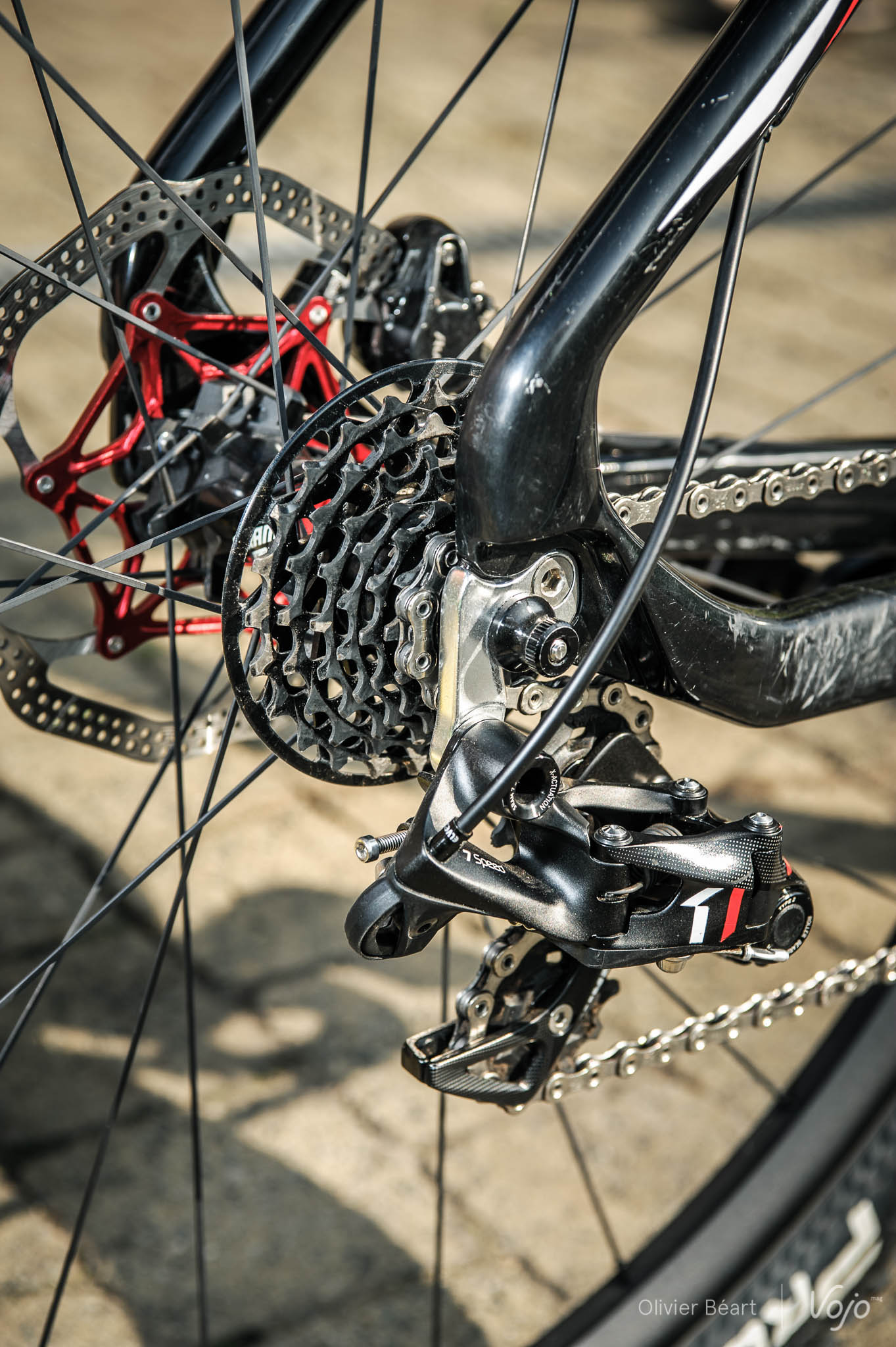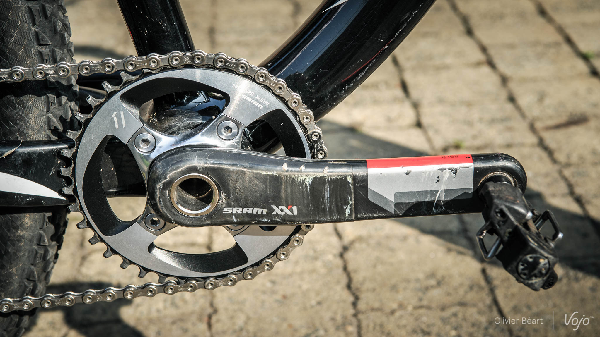 Côté dentures, Fabrice Mels emmène du gros: une couronne de 38 à l’avant, en Sram XX1… dont les dents ont ici déjà fameusement vécu. Pourtant, le champion signale qu’il n’a « jamais connu le moindre déraillement en course », et qu’il n’envisage par de placer d’anti-déraillement complémentaire, même par sécurité. Confiance totale !