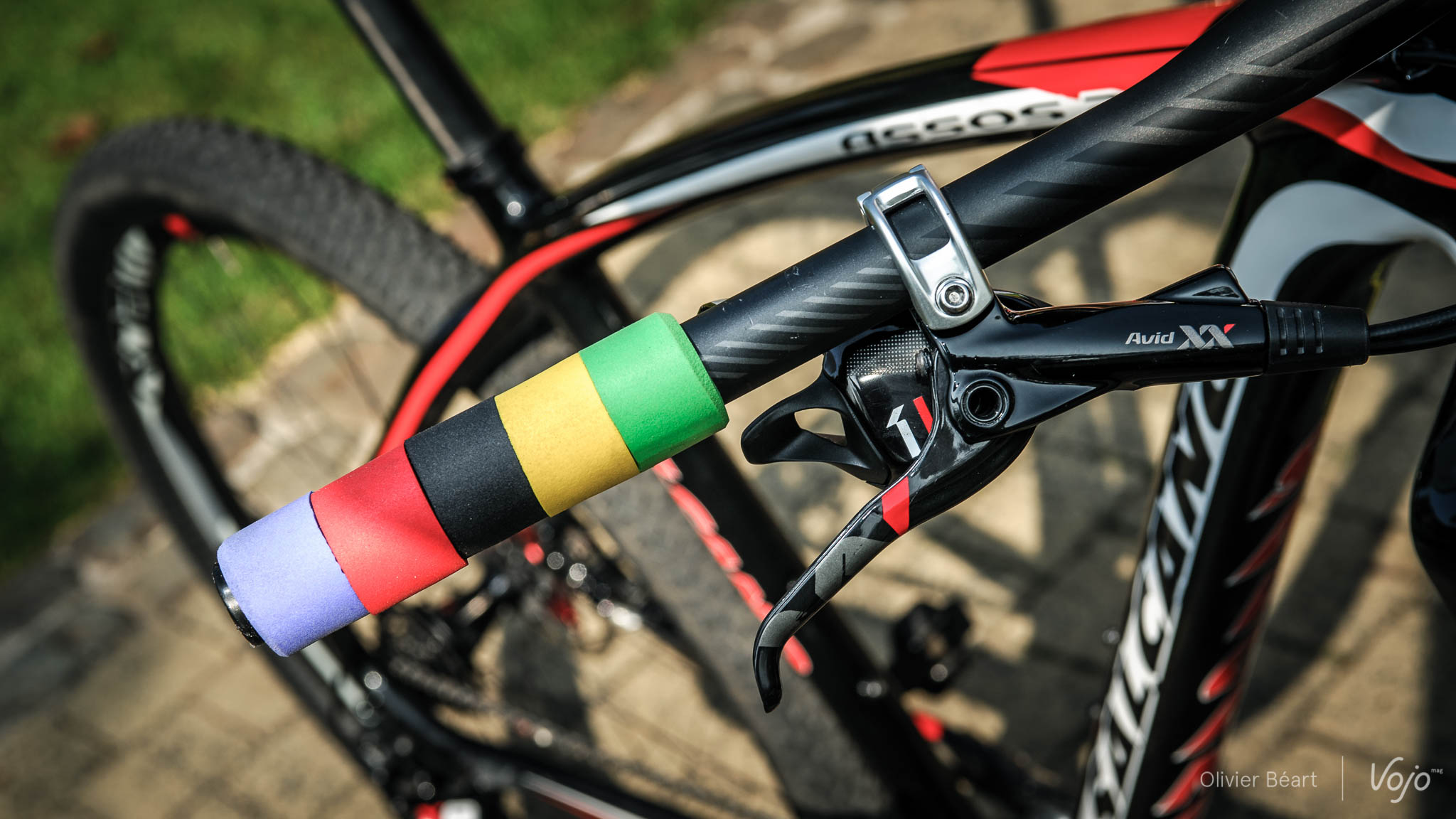 Privilège de champion du Monde, ESI Grips lui a fourni un kit spécial de ses fameuses poignées en silicone aux couleurs de l’arc-en-ciel. Les freins sont des Avid XX World Cup avec disques de 160mm, bien suffisants en l’absence de longues descentes en XCE. Le cintre est un Specialized en alu de 700mm de large, comme la potence de 130mm inversée.