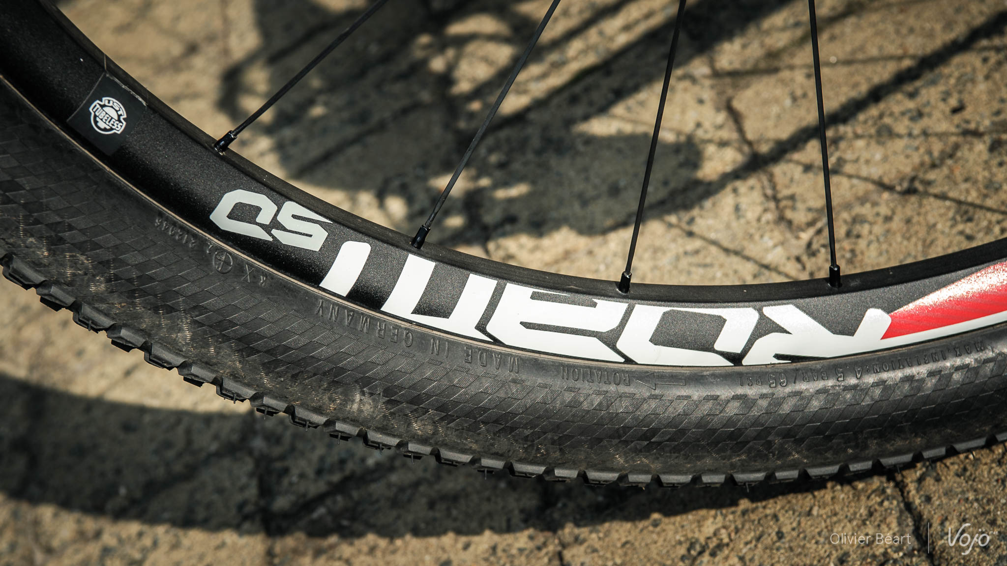 … Par contre, à l’arrière, son choix s’est porté sur la Sram Roam. Qui est loin d’être la plus légère, et qu’on rencontre plus souvent sur des vélos d’enduro. « A l’arrière, je ne peux pas me permettre le carbone. Je roule en semi-rigide, comme tout le monde en XCE, et comme c’est incroyablement intense et qu’il y a de la bagarre entre pilotes, on ne peut pas toujours choisir finement sa trajectoire. Ca tape souvent sur les pierres ! Sans parler des réceptions de sauts, ou des obstacles à franchir dans les courses type City Mountainbike Challenge. J’ai donc fait le choix de la roue Roam en alu derrière. J’aime aussi sa rigidité, qui lui permet de supporter ma puissance et de m’offrir le rendement souhaité. » Du côté des pneus, on retrouve des Continental Race King sur les deux roues. Leur très faible résistance au roulement est un atout. Mais Fabrice opte pour la version ProTection à flancs renforcés.