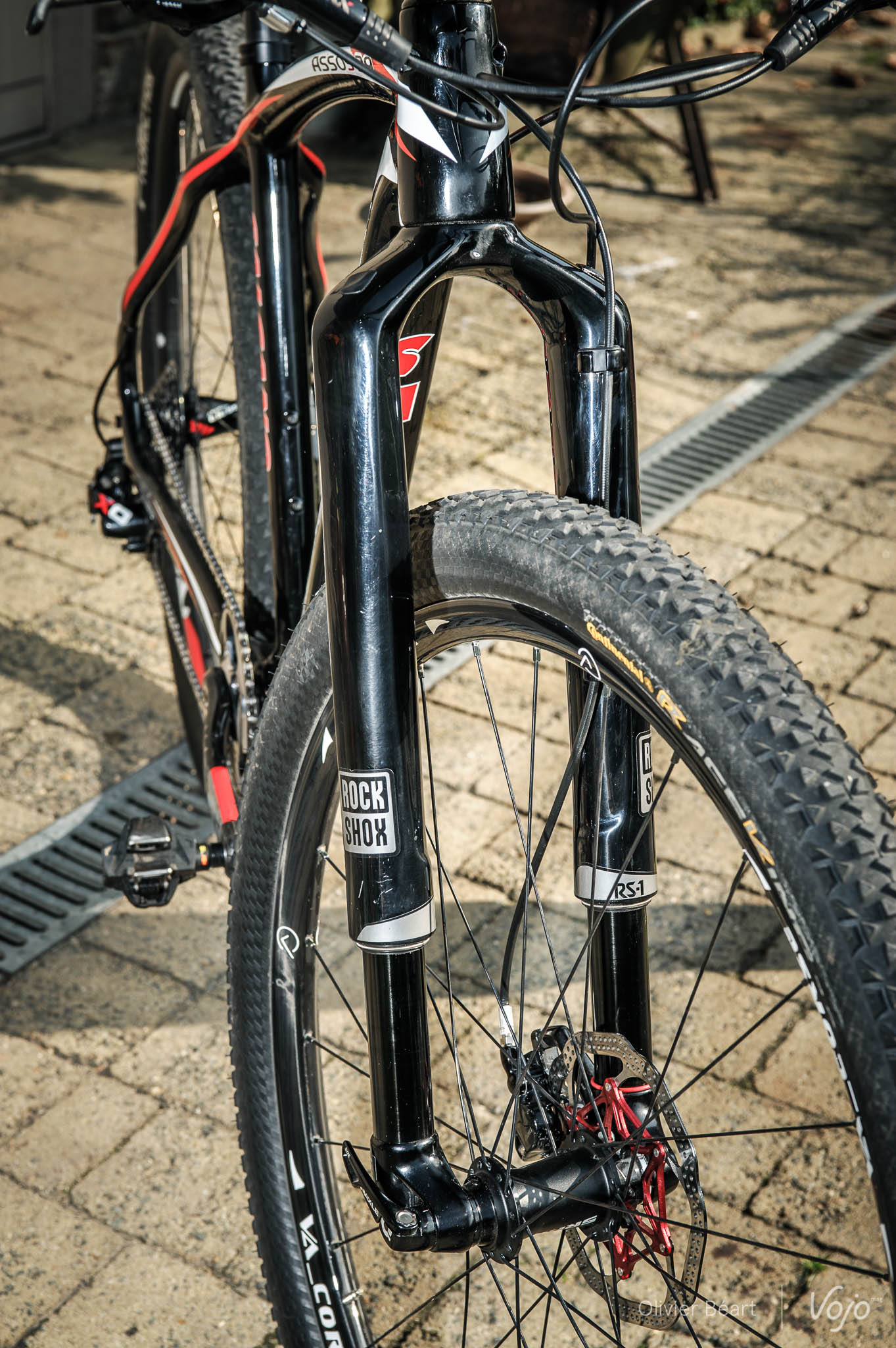 Du côté des roues, le champion varie les plaisirs. C’est toujours du 29 », mais avec des modèles différenciés : du carbone « VA Corse » pour l’avant, monté sur le moyeu Sram « Predictive Steering » propre à la RS1…