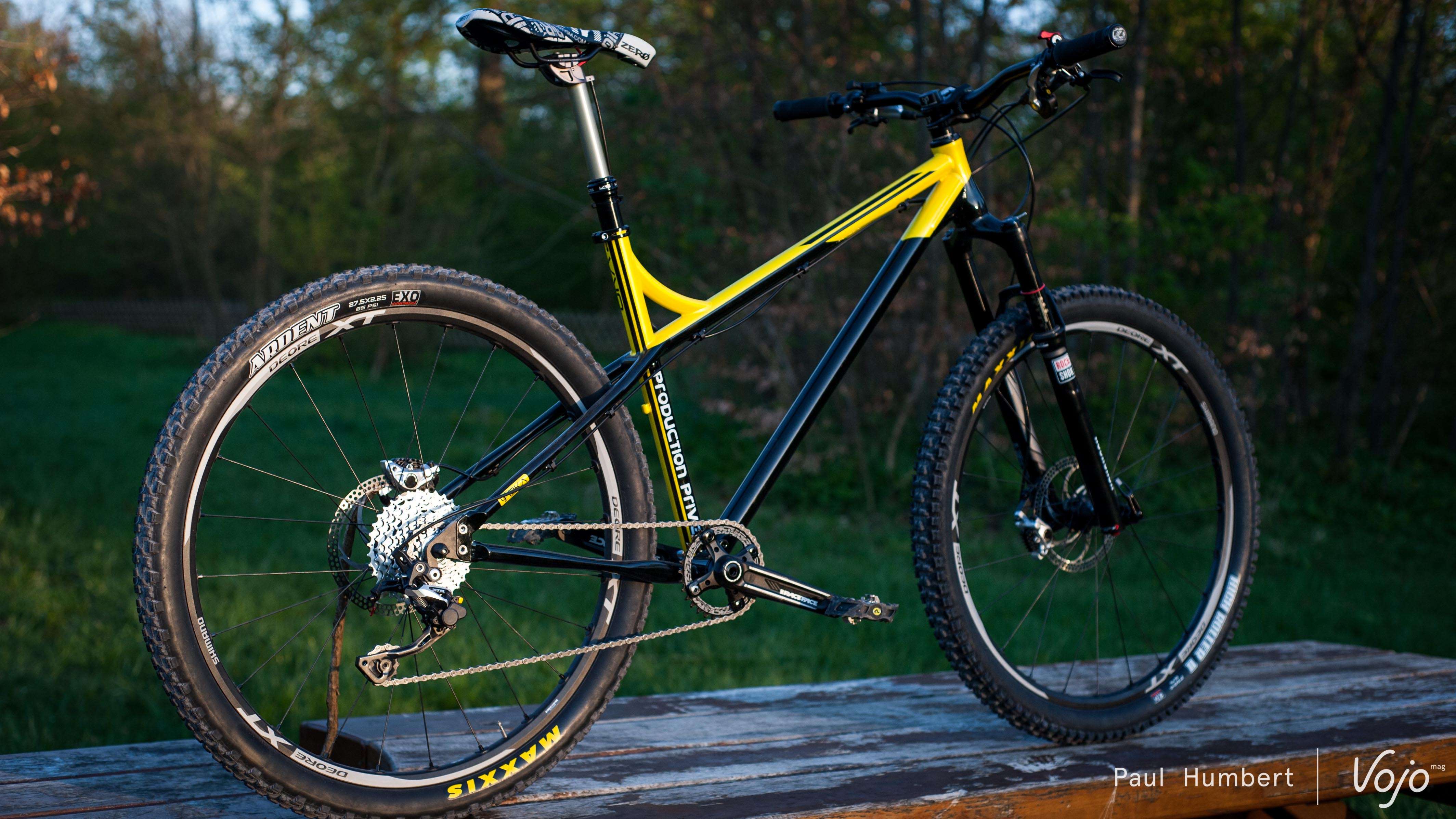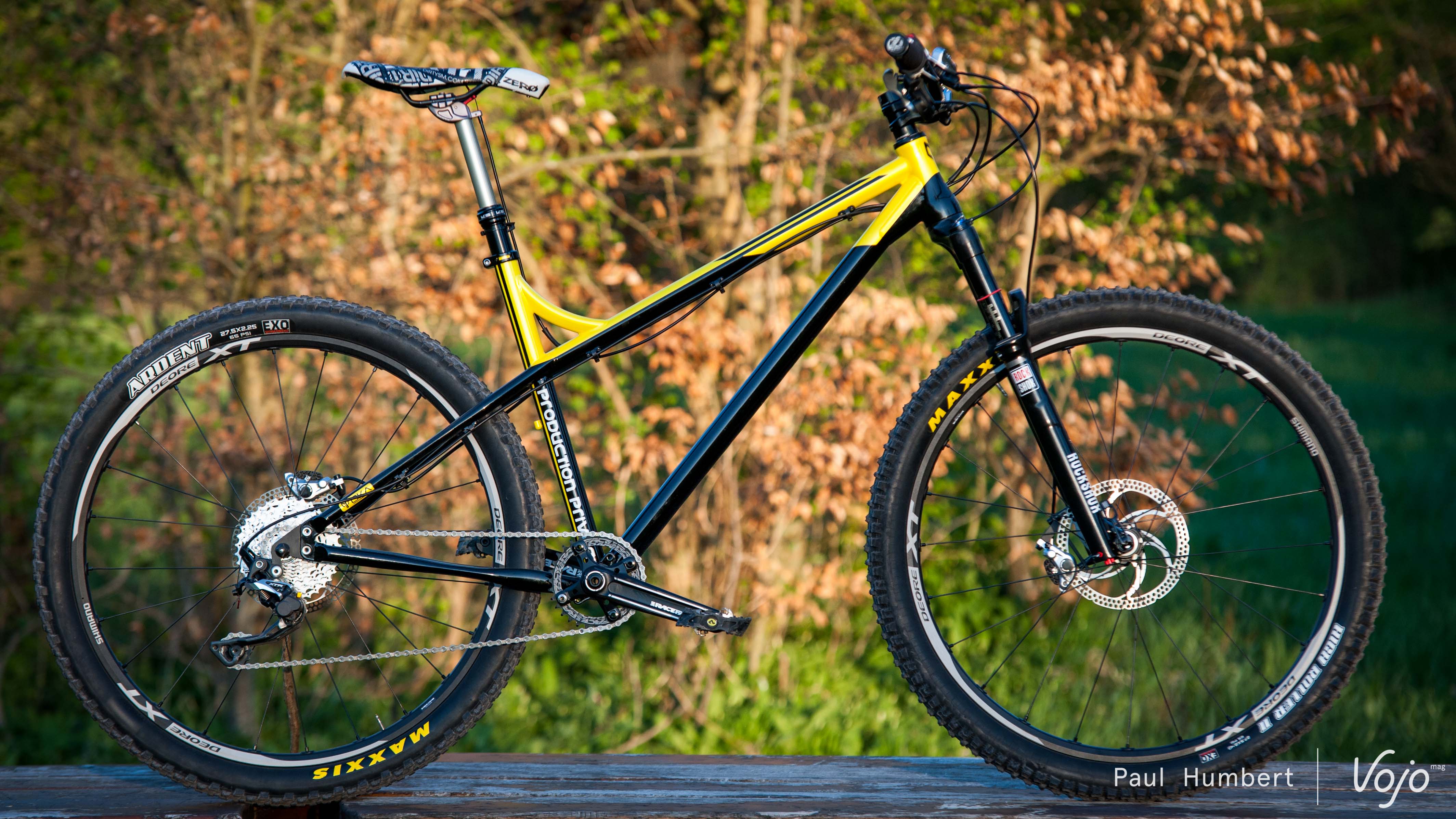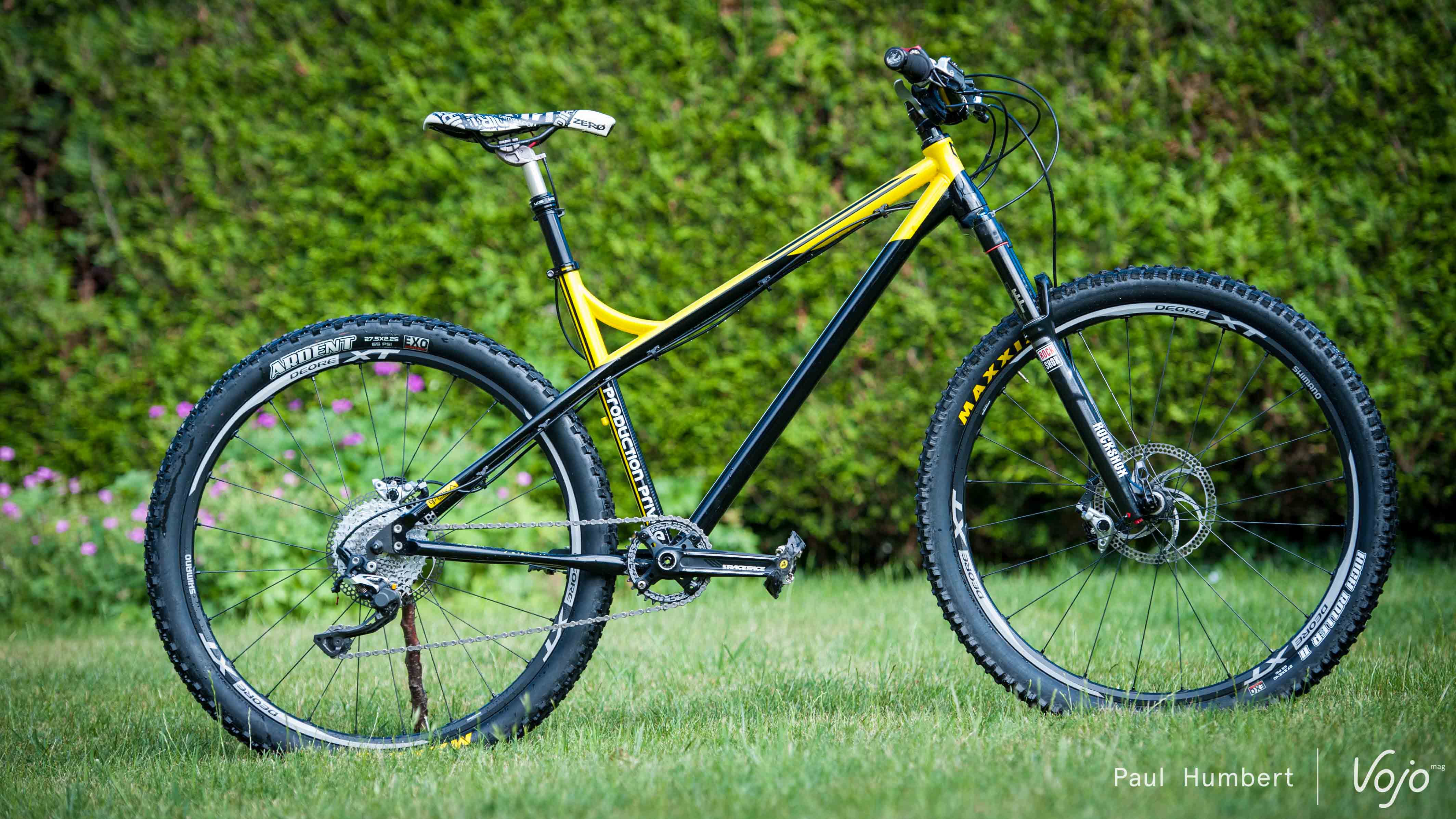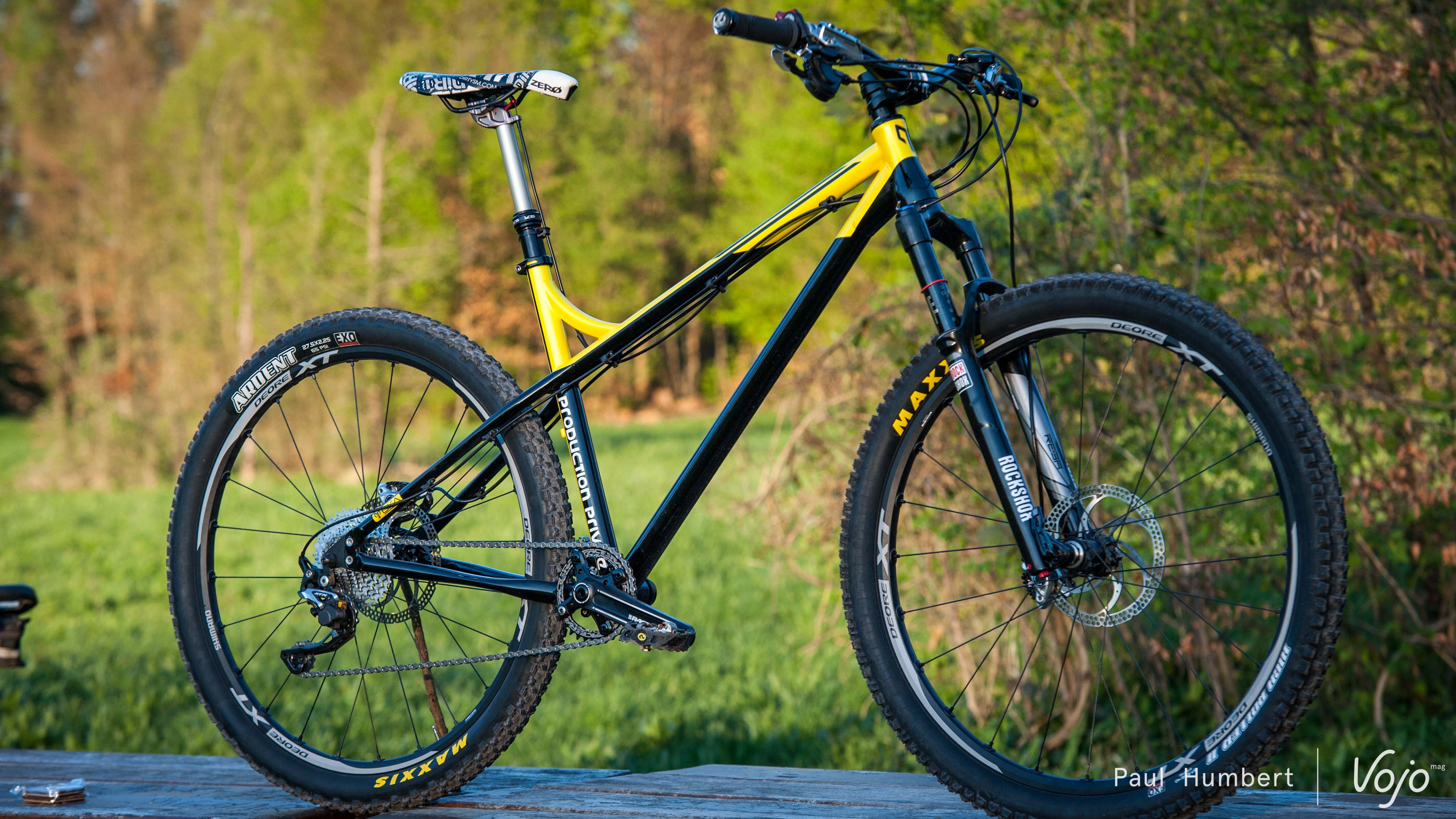 Production Privée ne commercialise que le cadre de cet OKA mais ce dernier est une plateforme très modulable et capable d’accueillir des montages très variés. Le vélo a été conçu pour être équipé d’une fourche de 120 à 140mm de débattement. Les bases arrières sont, par défaut, au standard 142×12 mais il est possible de les modifier pour passer à 10×135. Il est également possible d’équiper le vélo de roues de 26 pouces !