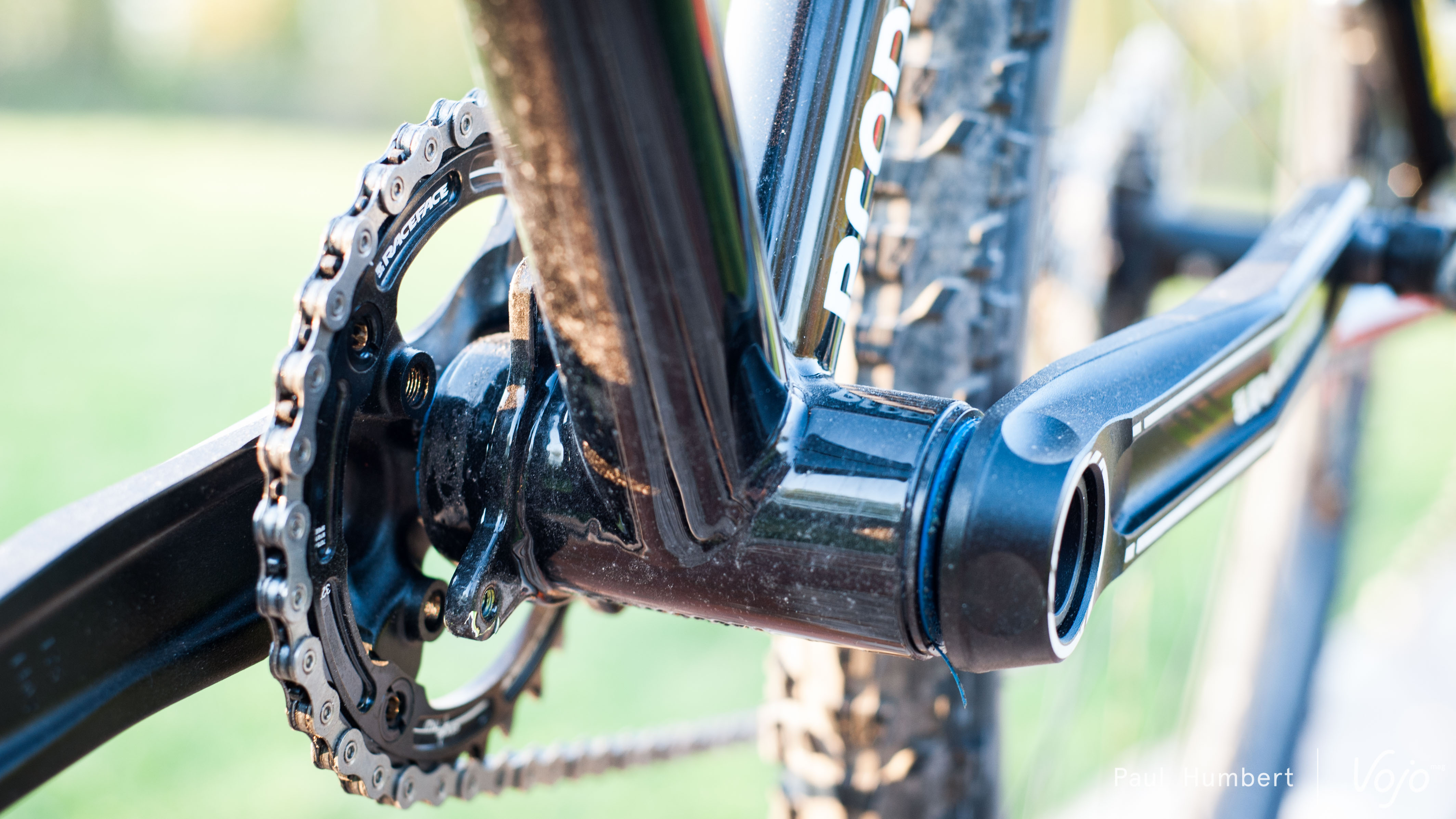 Le cadre est conçu pour un boitier de pédalier Pressfit et dispose de plots ISCG05. Il est disponible en 4 tailles (S, M, L et XL).