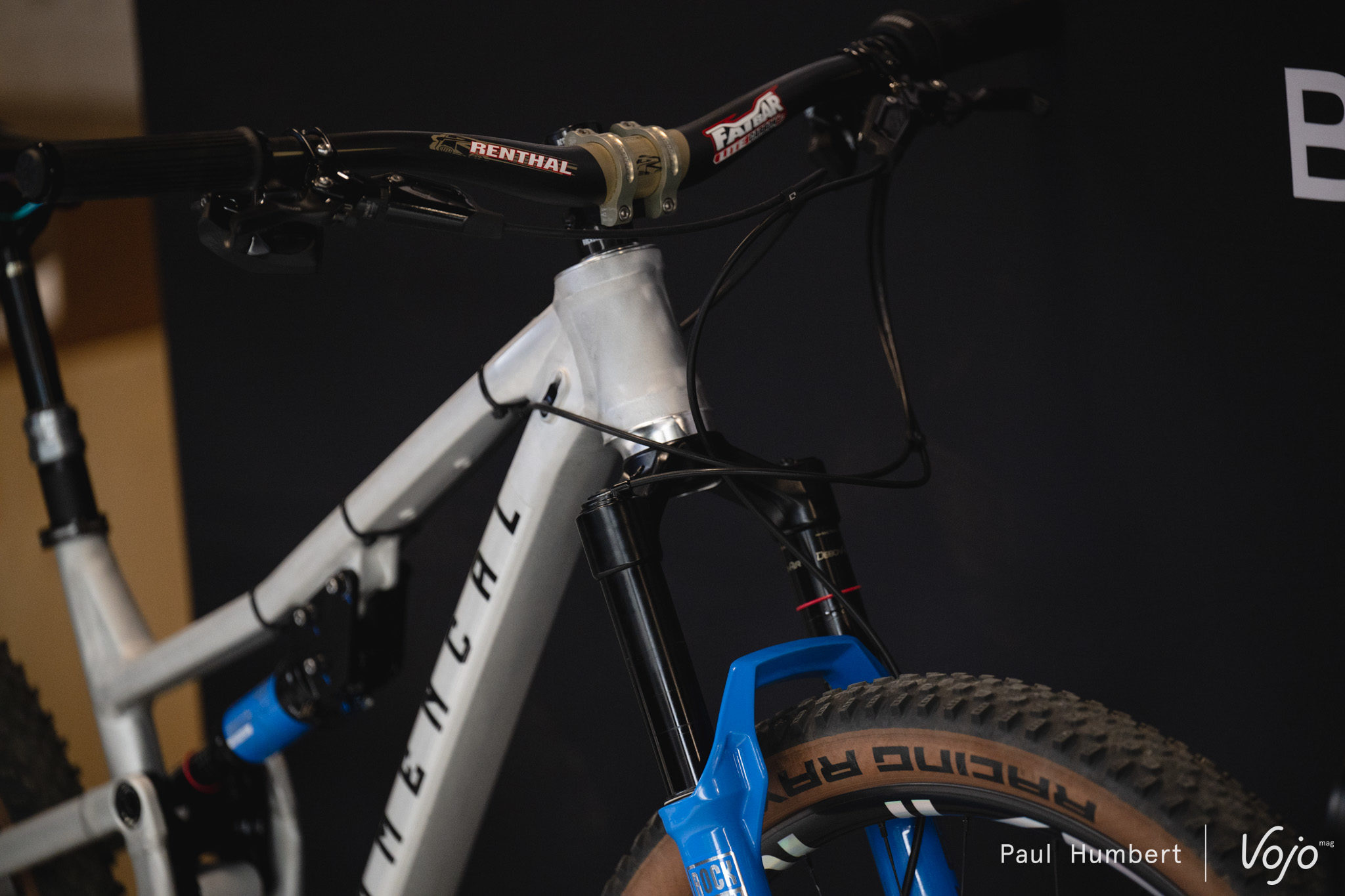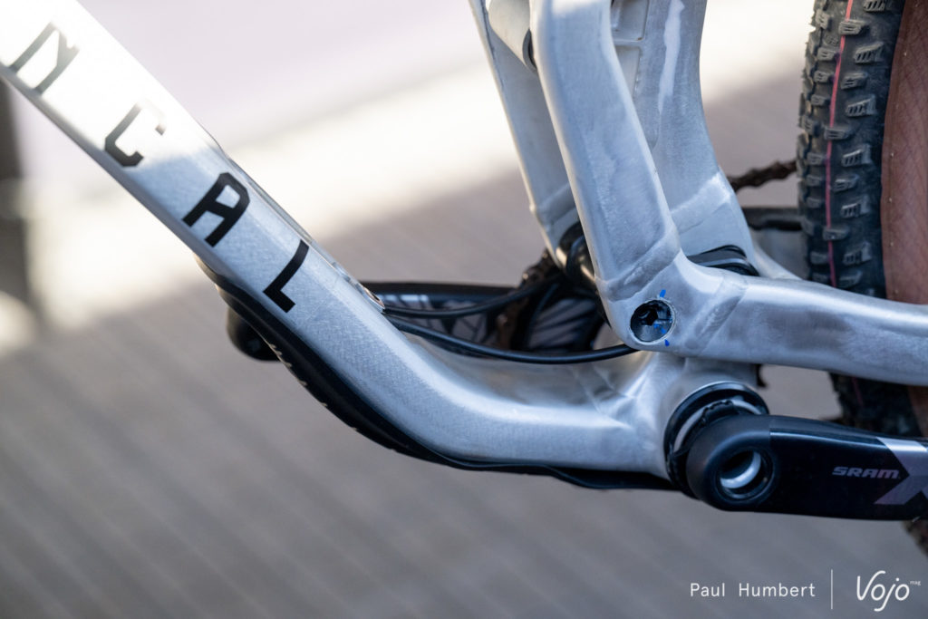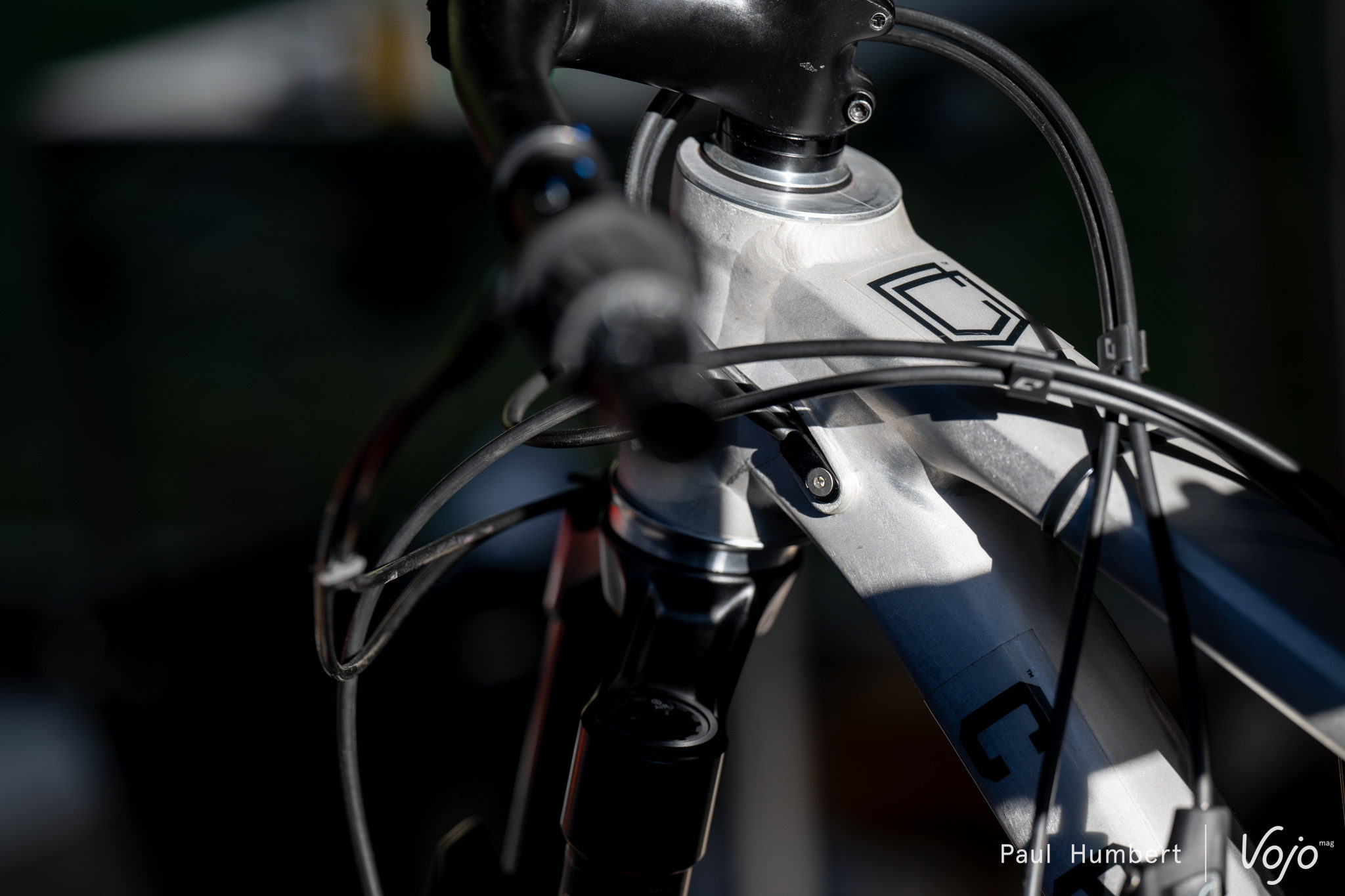 En effet, on remarque que la fixation de l’amortisseur est très peu raffinée et vissée plutôt que soudée, l’idéal pour essayer différentes positions. A l’avant, on repère aussi un jeu de direction réglable, qui permet probablement d’essayer différents angles de direction ou différents reach.