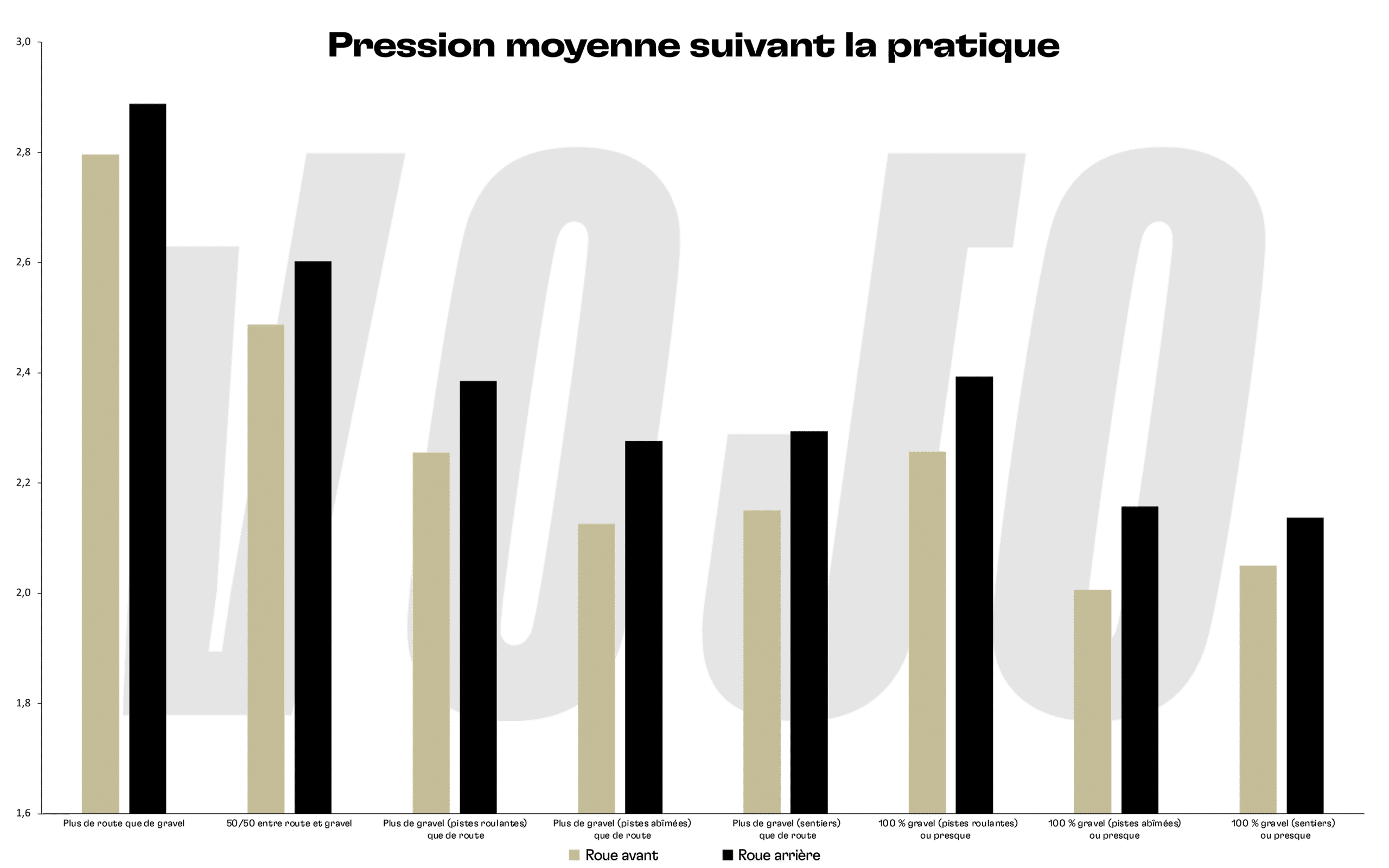 Retour à notre sondage. Les résultats offrent une fenêtre intéressante sur les conditions dans lesquelles vous pratiquez le gravel et ça pourrait même mériter un article à part entière, mais sur le sujet des pressions, une chose est sûre : la tendance est aux pressions entre 2 et 3 bars, avec une moyenne à 2,3 bars pour l’avant et 2,4 bars pour l’arrière. La distribution varie un peu entre les deux roues mais on peut résumer grossièrement en disant qu’un tiers d’entre vous gonflent à moins de 2,2 bars, un tiers entre 2,2 et 2,5 bars, et un tiers au-delà de 2,5 bars.