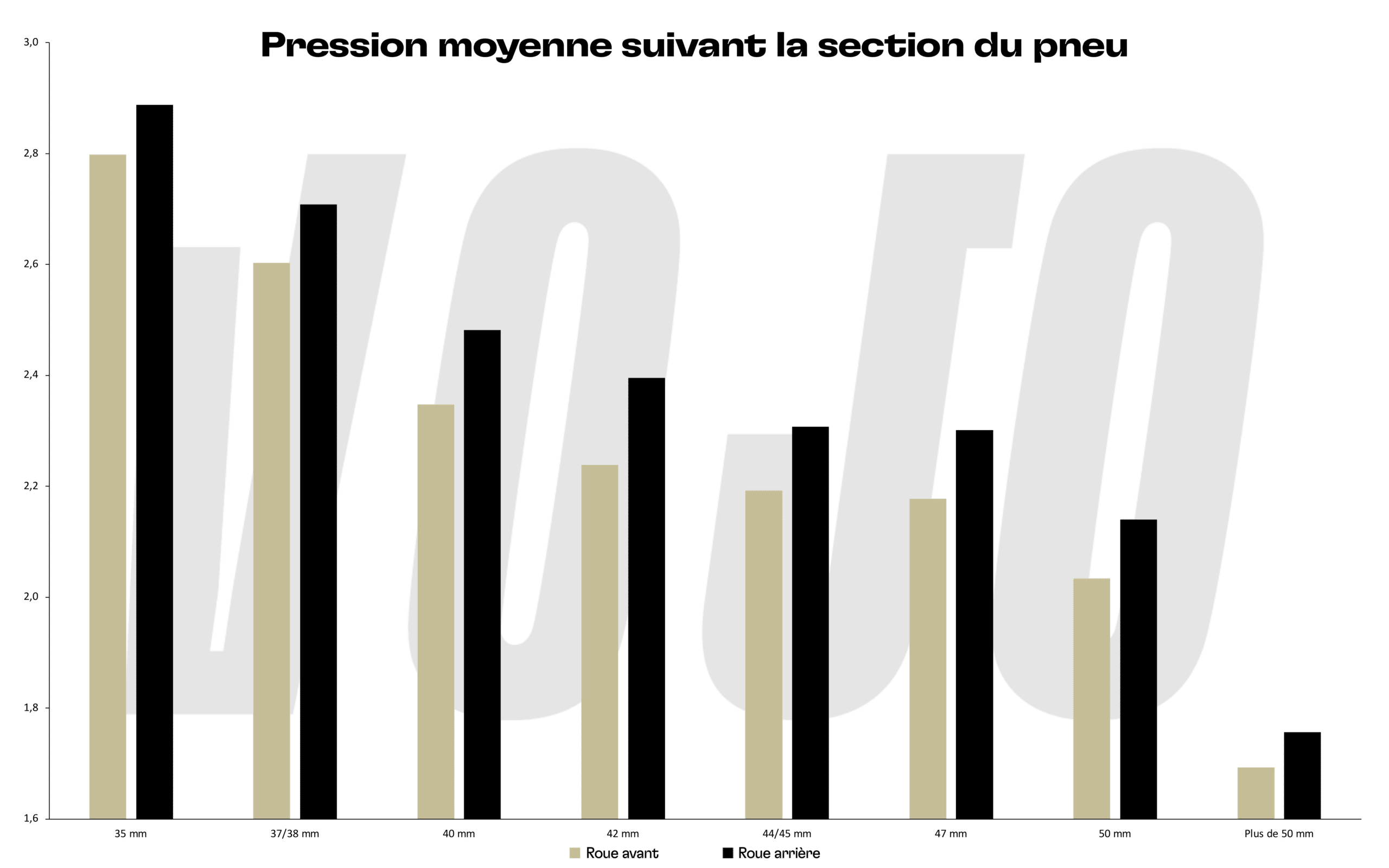 Evidemment, de nombreux paramètres influencent le choix de la pression : le poids de l’ensemble pilote + vélo, le terrain de pratique, le montage (22 % d’entre vous sont encore en chambre à air), la section du pneu, la carcasse de ce dernier et même la largeur de jante, pour laquelle Joël considère que 2 mm font une différence significative et qu’il faut alors ajuster la pression : plus c’est étroit, plus il faut augmenter. C’est pour cette raison que nous nous garderons bien de vous donner un tableau avec la pression prétendument idéale en fonction du poids.