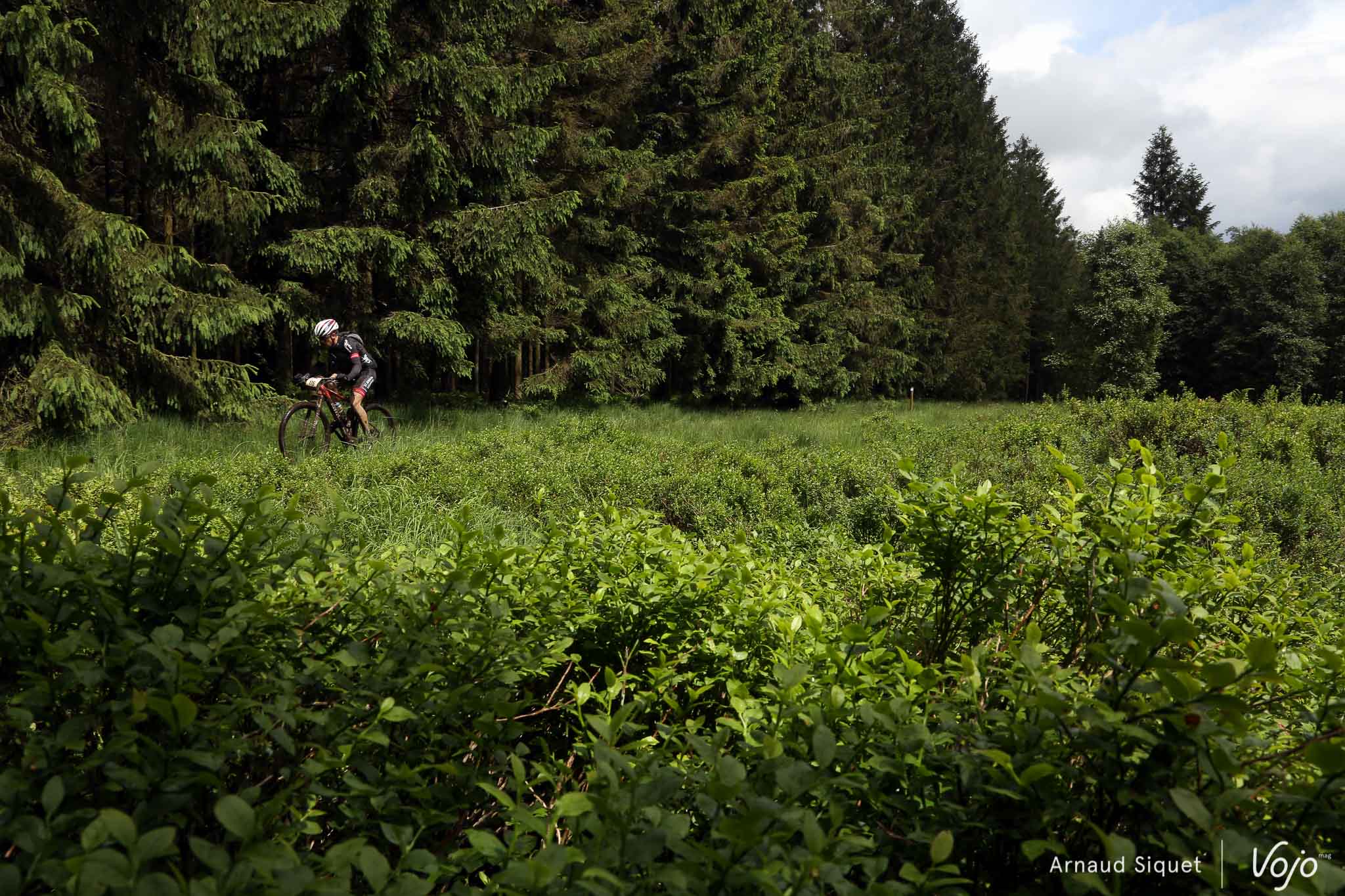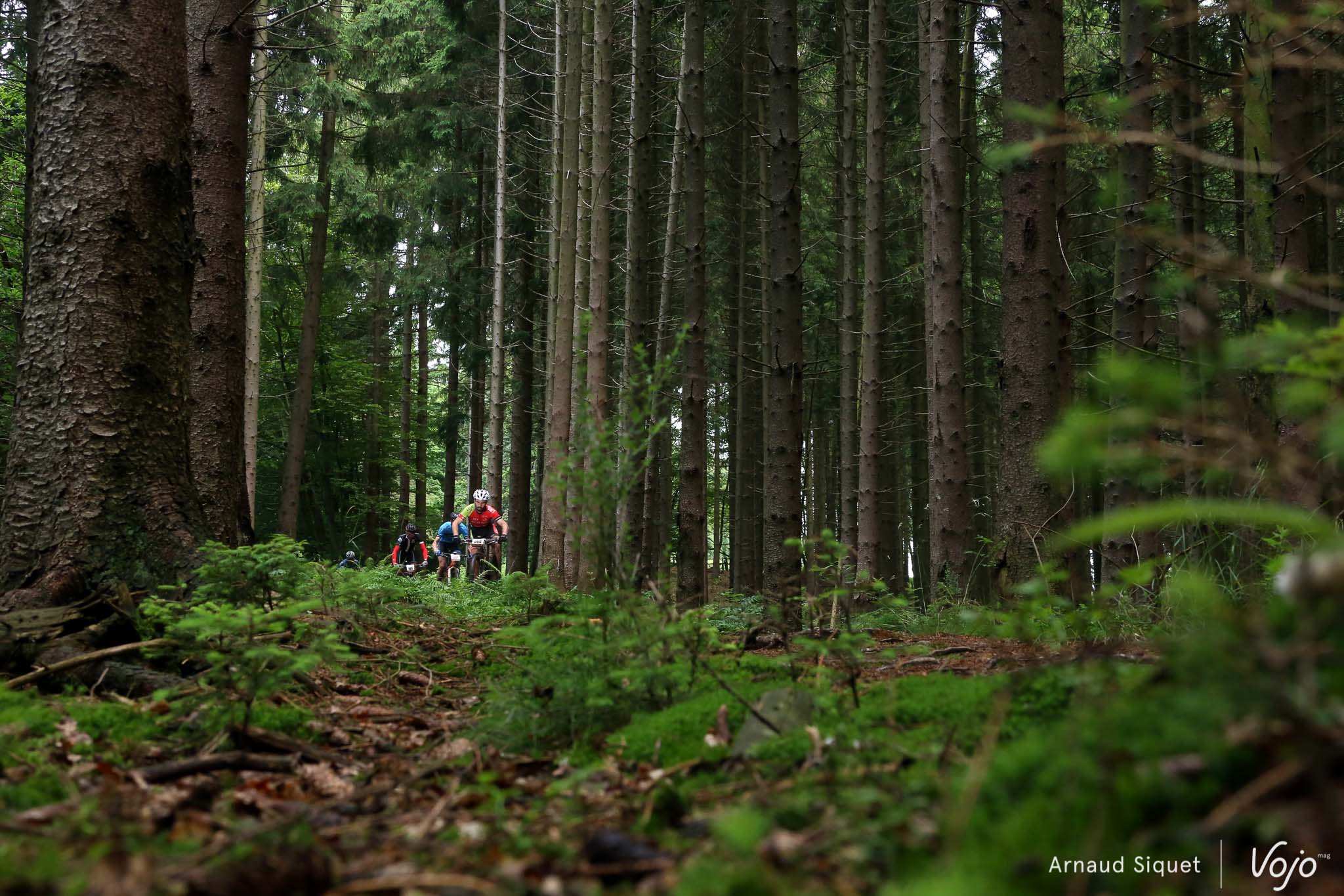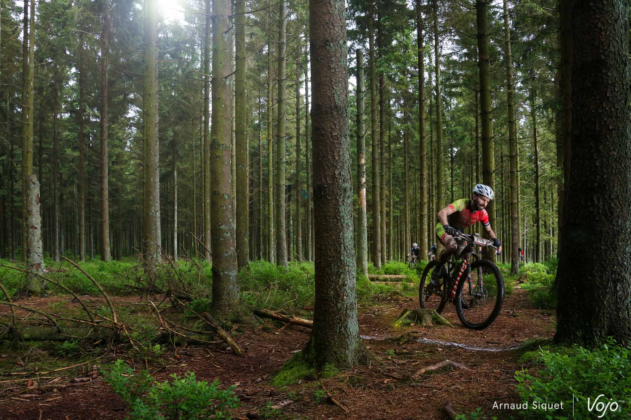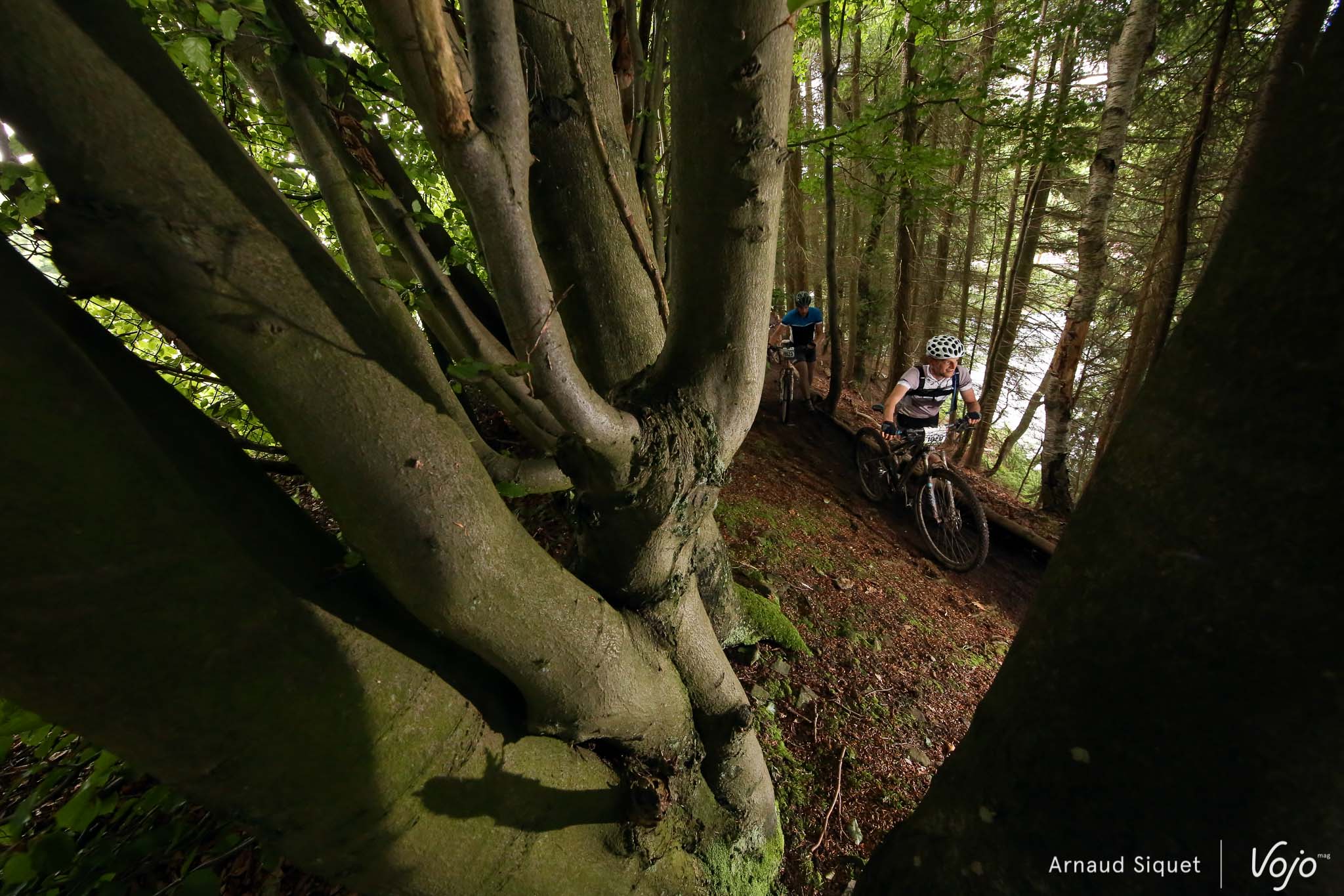 Les côtes longues et raides laissent un temps la place à de multiples tronçons à travers les sapinières où s’entremêlent d’impressionnantes racines et de profonds bourbiers. Il faut parfois faire preuve d’agilité afin de tout passer sur le vélo!