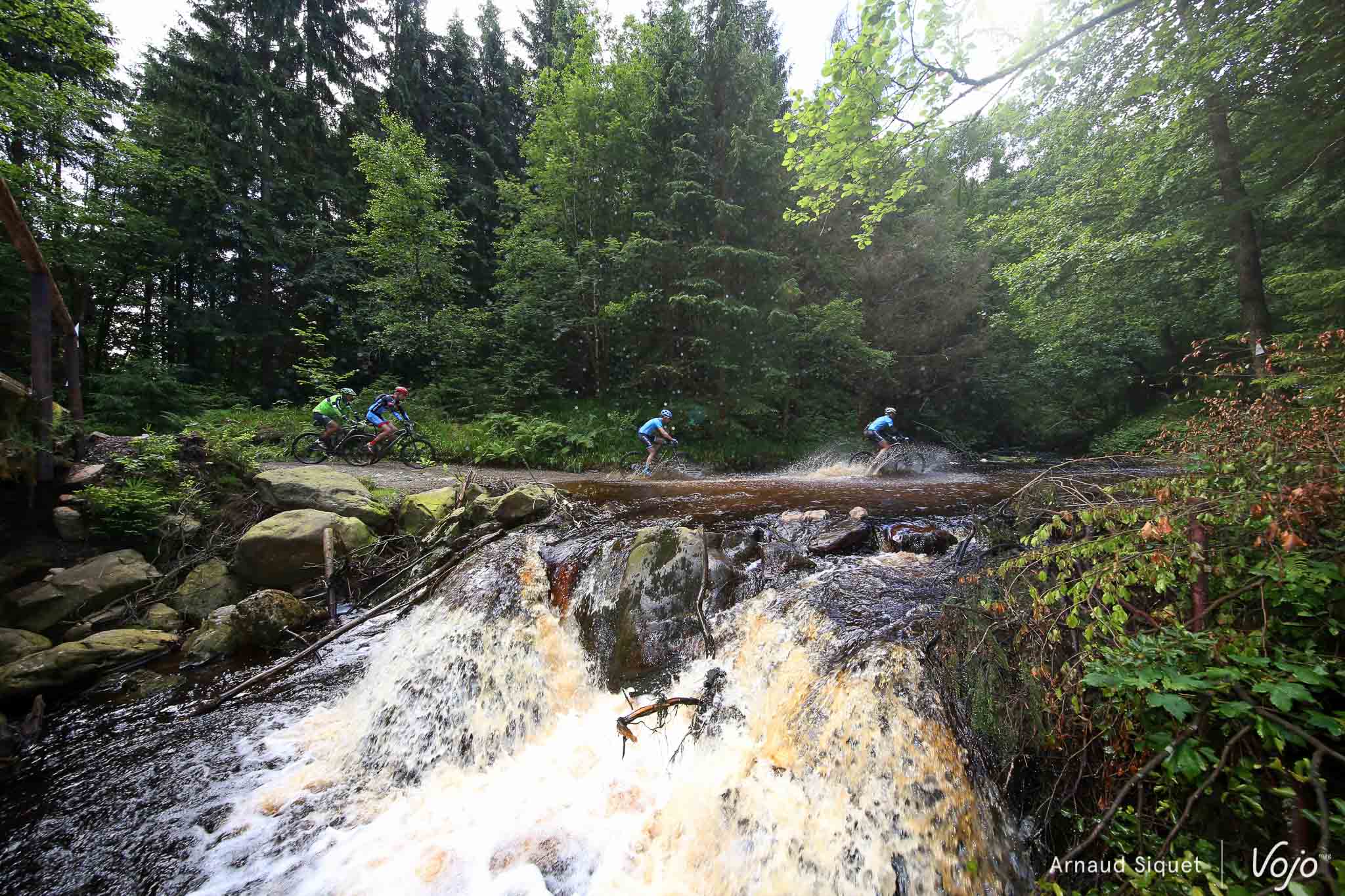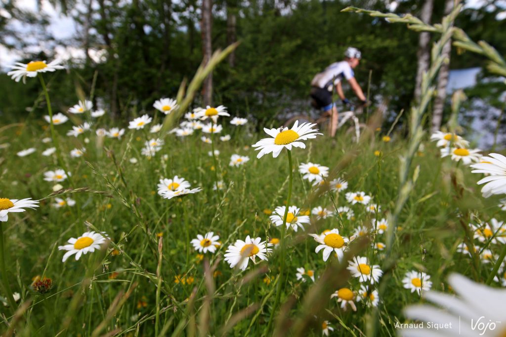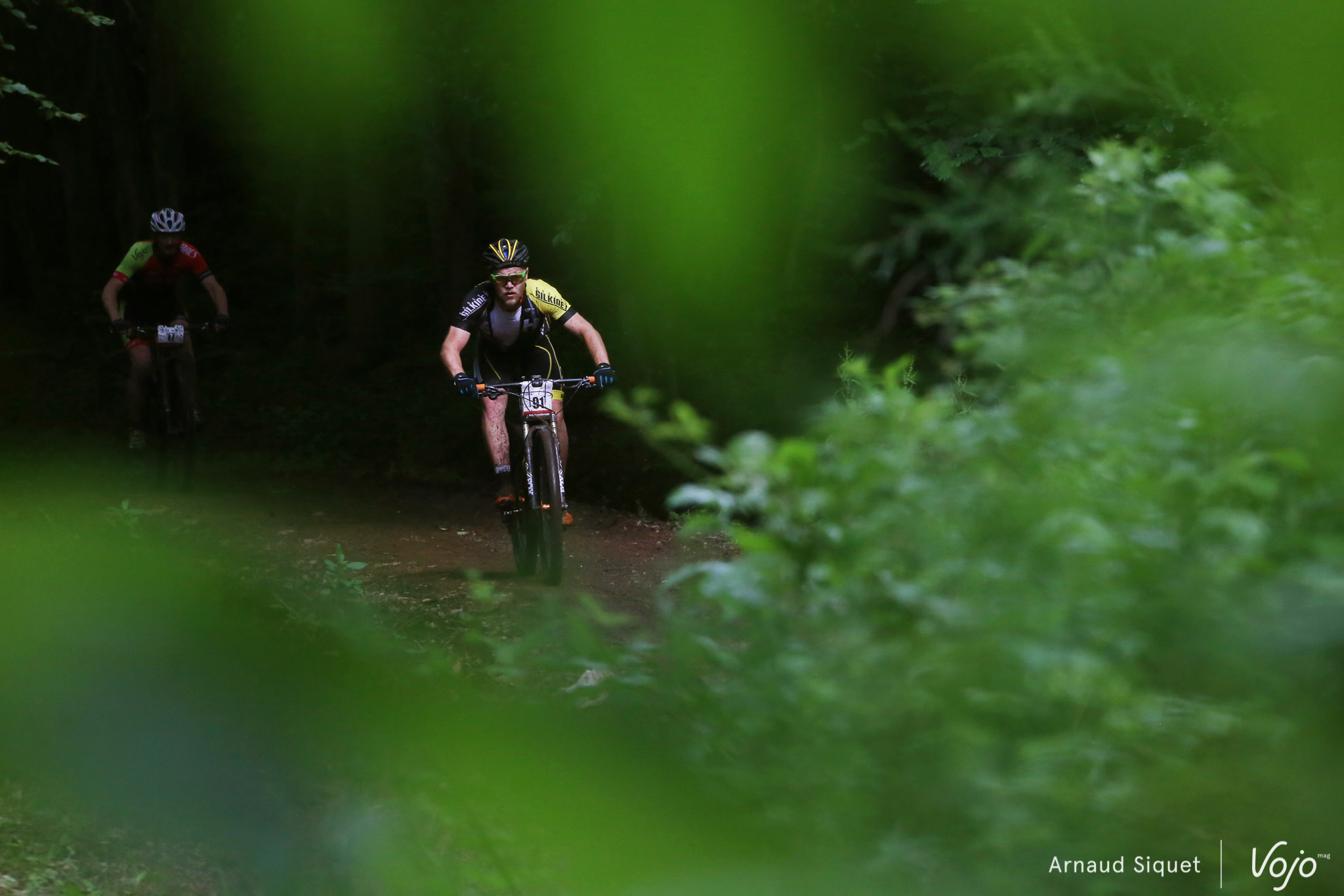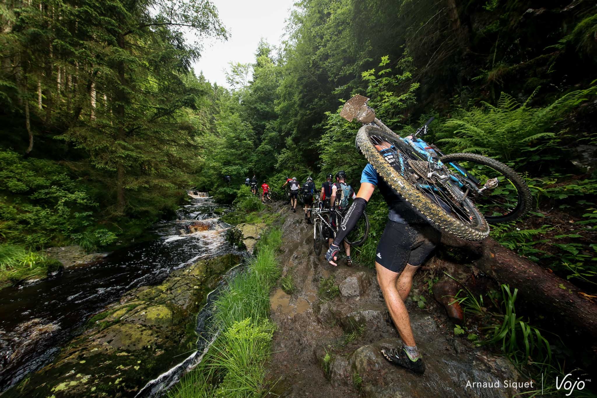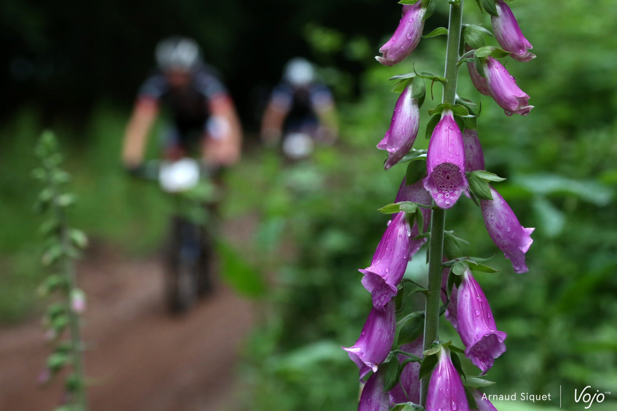 Les côtes longues et raides laissent un temps la place à de multiples tronçons à travers les sapinières où s’entremêlent d’impressionnantes racines et de profonds bourbiers. Il faut parfois faire preuve d’agilité afin de tout passer sur le vélo!
