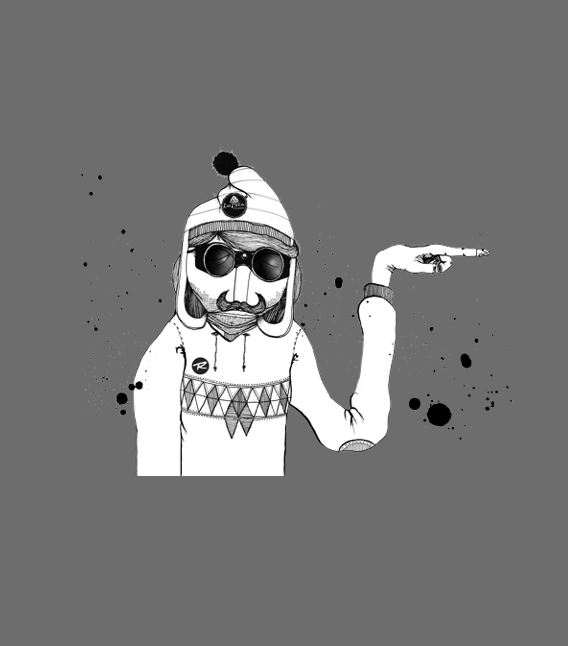 Ainsi est né le Rancho Webshow. « On l’a tout de suite pensé comme une marque, avec une identité et des points d’ancrage forts », précise Enak. Le tout incarné par Rancho, un personnage qui n’en est pas vraiment un : « Avec Base Man, on s’était bien aperçu qu’on n’était pas acteurs, donc Rancho, ça devait être moi », explique Enak. Il a alors repris son bonnet difforme, ses lunettes de glacier, son sweat Motobécane, qu’il portait déjà dans sa vie d’athlète freeride et skicross. Y a ajouté des éperons (pour le côté western spaghetti), un caban en référence à Corto Maltese (car Rancho allait explorer des territoires de glisse inconnus), un jean moutarde ou saumon selon les épisodes (pour… la couleur?) et… une moustache.