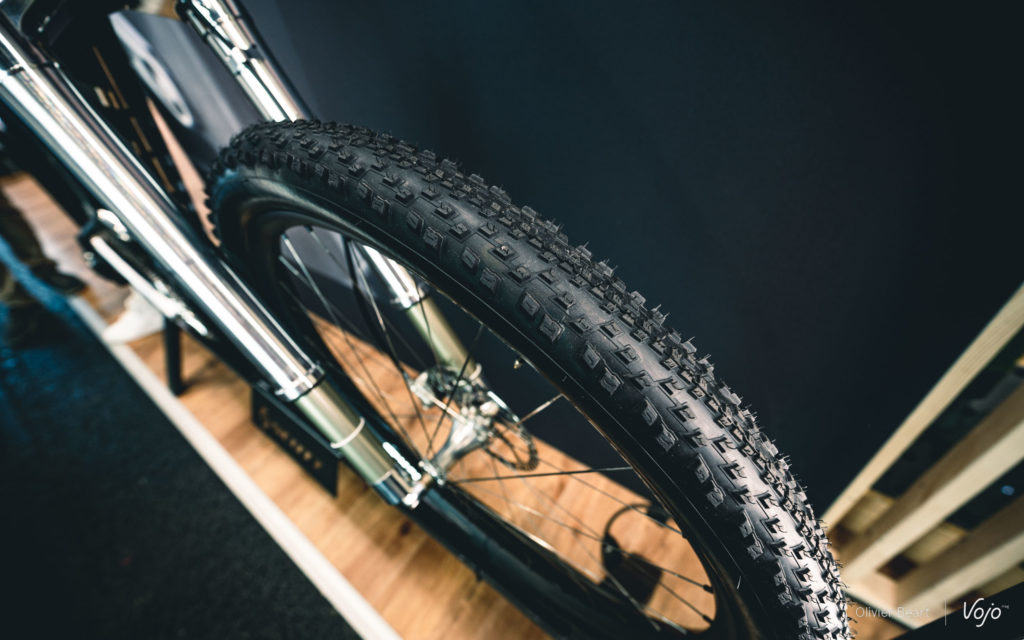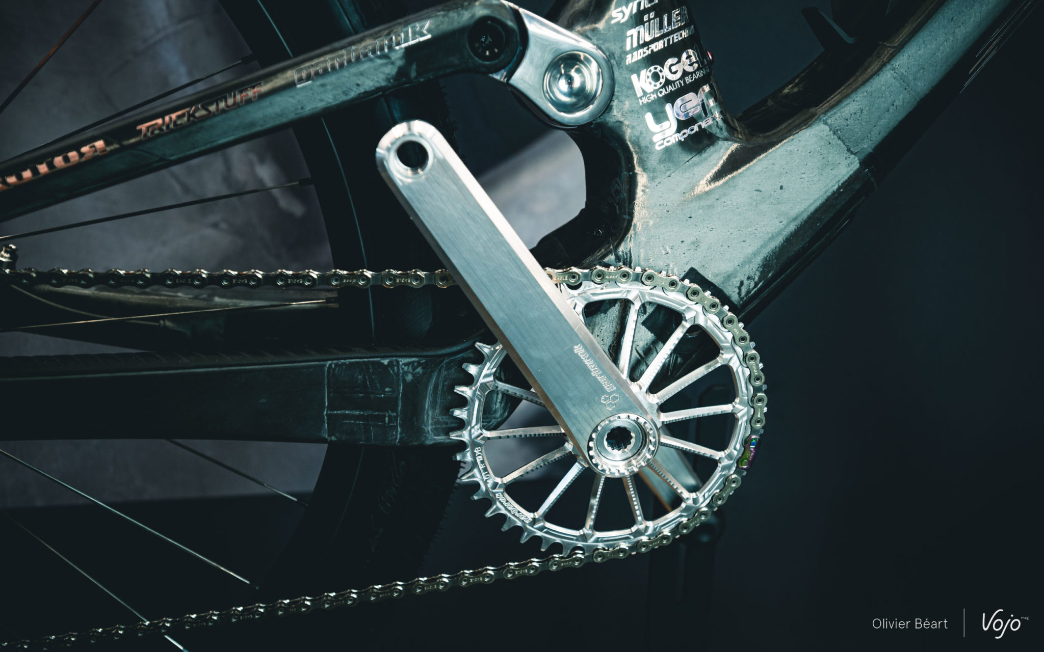 « Le but est de faire un vélo où on va chercher à gratter les grammes là où c’est possible, tout en gardant de vrais gros pneus solides et bien cramponnés et une fourche Intend en 130mm de débattement. Vous remarquerez aussi les manivelles, qui sont un prototype en titane imprimé 3D. »