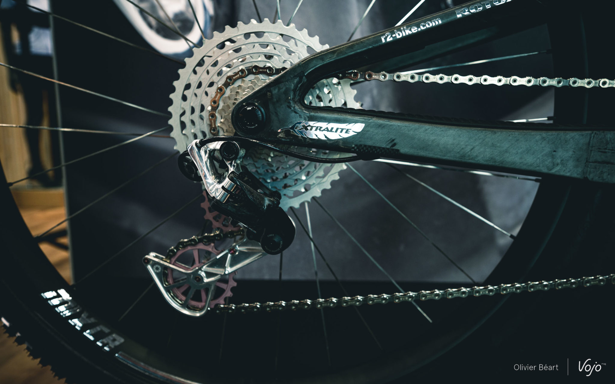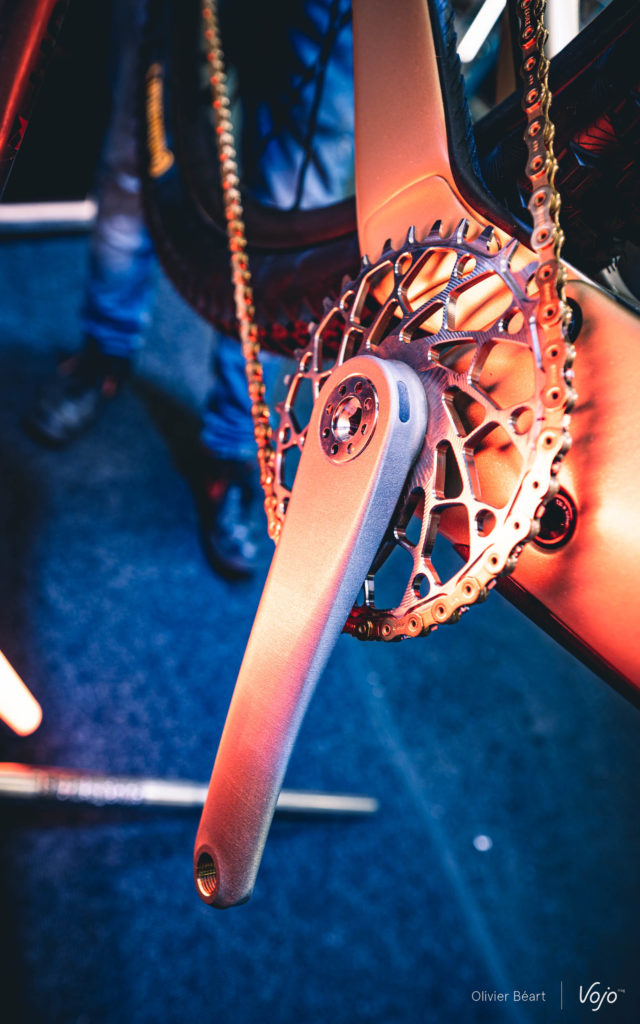 « Au niveau de la transmission, j’ai une paire de manivelles Garbaruk prototype en alu. Et je suis resté sur une transmission mécanique. J’aime beaucoup le fonctionnement du Sram AXS, que j’aime combiner avec les commandes Zirbel très discrètes, mais le dérailleur AXS est très massif, plus difficile à alléger, et j’aime aussi toujours le côté plus épuré du mécanique au niveau du dérailleur. Qui a aussi été modifié avec des pièces carbone et une cage alu custom. Au final, j’arrive à 9,19kg ! »