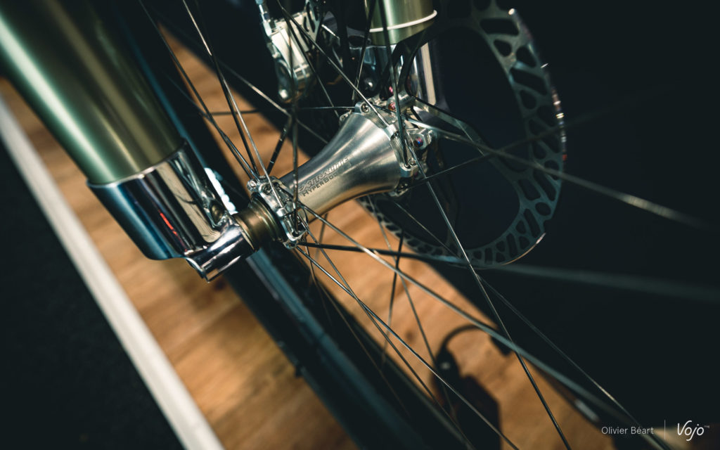 « J’ai notamment mis des roues hyper légères, avec des jantes Müller Radsporttechniek et des moyeux Extralite qui me permettent d’arriver à 1035g la paire de roues avec des jantes en 30mm. »