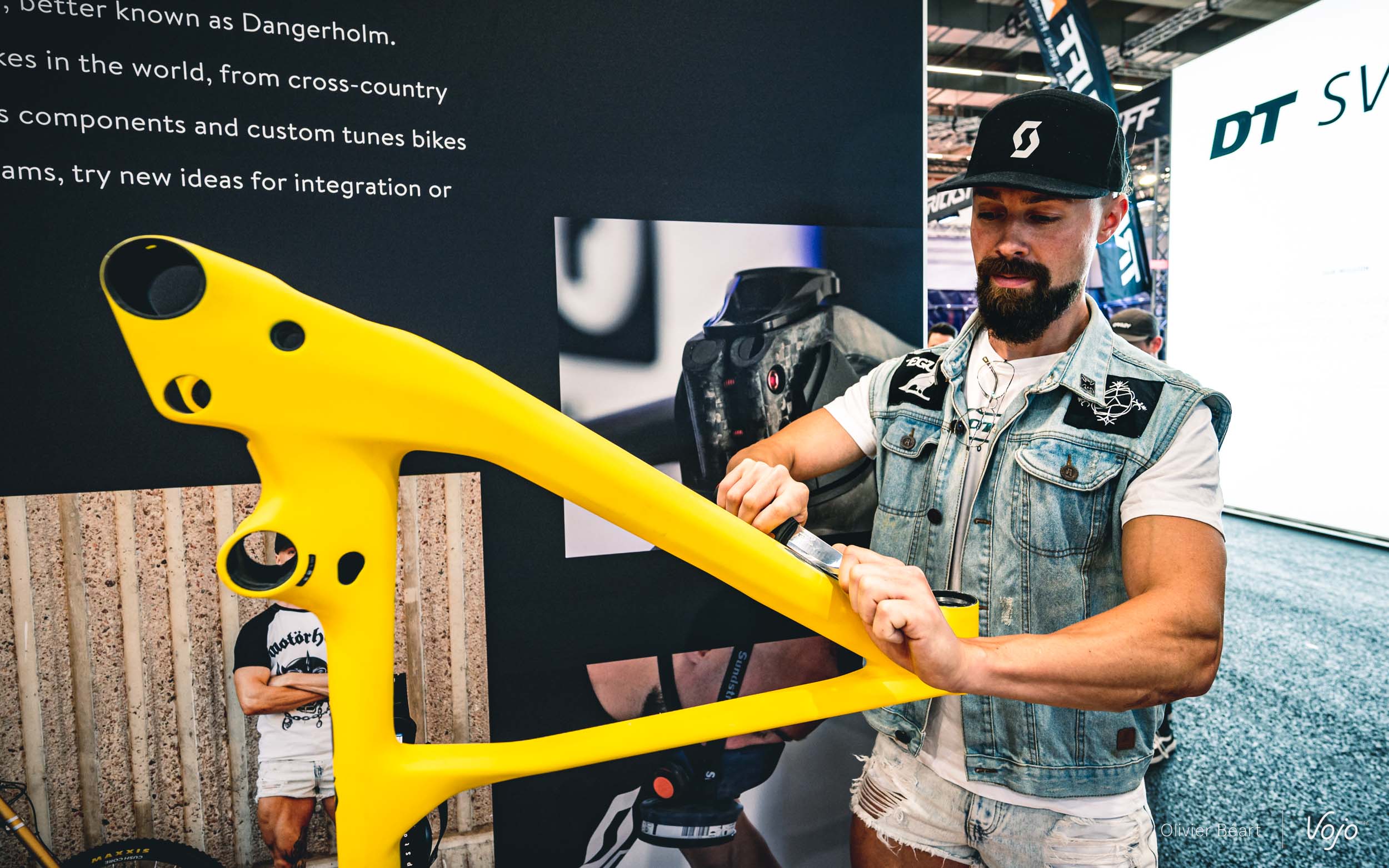 Difficile d’ignorer sa présence sur le stand Scott à l’Eurobike 2022 : Gustav Gullholm, alias « Dangerholm », nouveau gourou du VTT ultra léger, exposait ses dernières réalisations. Et le moins qu’on puisse dire, c’est que le bonhomme est populaire, à en juger par les attroupements quasi permanents devant ses machines allégées à l’extrême et au look aussi flamboyant que celui de leur géniteur. Extrêmement disponible pour poser avec ses fans, signer des autographes et donner de bons conseils pour alléger sa monture, il a trouvé quelques minutes pour nous accorder une petite interview.