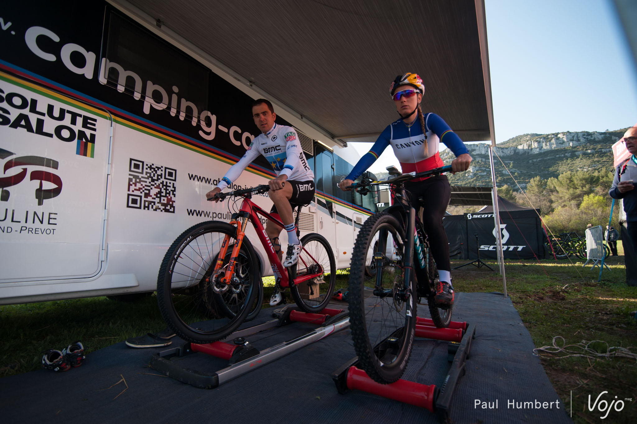 Entre deux questions, Pauline Ferrand Prévot passe une tête dans le camping-car. L’occasion pour nous de demander à Julien ce que vivre et s’entraîner avec une telle athlète peut lui apporter sur le plan sportif : «Avant tout de le motivation. Nous avons les mêmes objectifs, on part ensemble aux entraînements etc. Le programme de Pauline diffère par moment, quand elle se prépare pour les classiques belges par exemple. ». À quelques kilomètres de là, Titouan est sur la même longueur d’onde, «les arguments sont les mêmes que ceux de Julien. Avec Lucie (Urruty) on se motive et si nos parcours diffèrent parfois, on se motive mutuellement »