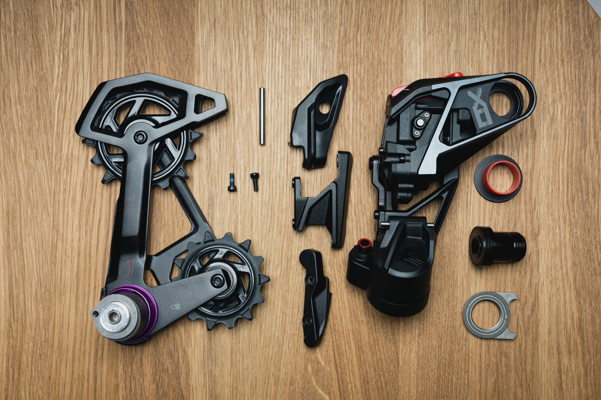 Et comme un problème peut tout de même survenir malgré tout ça, Sram a aussi travaillé sur la réparabilité du système. Si vous avez bien suivi l’actualité sur le sujet, ce n’est peut-être qu’une demi-surprise. A l’instar de la fixation Full Mount, on l’avait un peu vu venir grâce à des brevets publiés à la toute fin 2022 (lire Innovations | Sram : le futur dérailleur réparable de A à Z ?). Le dérailleur est donc facilement réparable à plusieurs niveaux : on peut changer la chape en un tour de main (littéralement) ou remplacer les branches extérieures du parallélogramme et la Skid Plate, cette pièce de protection qui ne sert à rien d’autre qu’à protéger le dérailleur, en quelques coups de clé. L’idée est de ne pas avoir à remplacer tout son dérailleur en cas de problème et de ne plus avoir peur de la grosse rayure sur son dérailleur tout neuf…