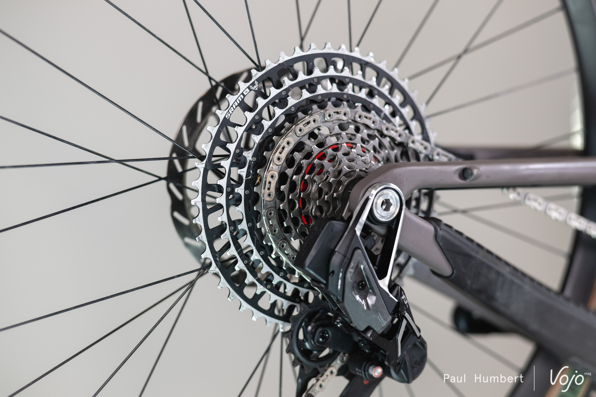 Toutefois, le plus important est ailleurs et il est invisible. Sram a travaillé sur la synchronisation entre la cassette et le dérailleur pour faire en sorte que la chaîne soit toujours engagée sur un maximum de dents même au cours d’un changement de rapport. Ainsi, les rampes qui permettent les déplacements de la chaîne ont été dessinées de façon à ce que la chaîne s’engage sur deux pignons à la fois, à la montée comme à la descente. En plus de cela, lorsqu’on change plusieurs vitesses d’un coup le dérailleur « attend » que la chaîne se soit engagée correctement sur chaque pignon avant de passer au suivant.