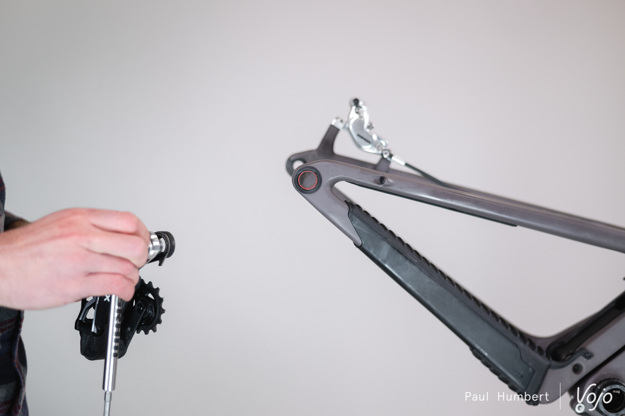 Plus de patte de dérailleur, ça a aussi un intérêt majeur pour l’installation et le réglage du système. Aujourd’hui, les vis de butées haute et basse servent à compenser les petites variations de position qu’il peut y avoir entre les différents cadres et leurs pattes de dérailleur. Si le dérailleur est fixé directement sur le cadre et que l’interface est la même partout, elles n’ont plus lieu d’être. Sram sait à l’avance précisément où sera le dérailleur vis-à-vis de la cassette alors à quoi serviraient des réglages ?