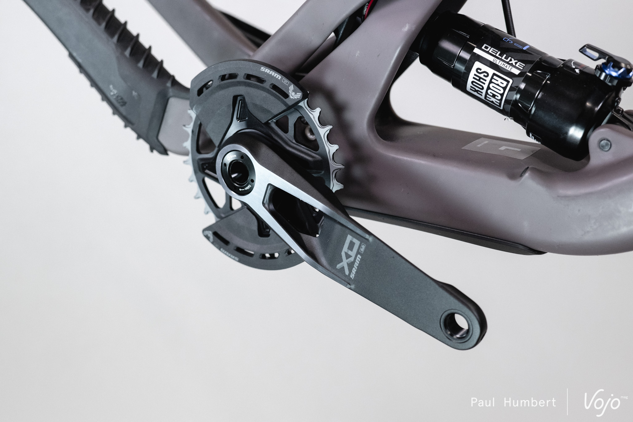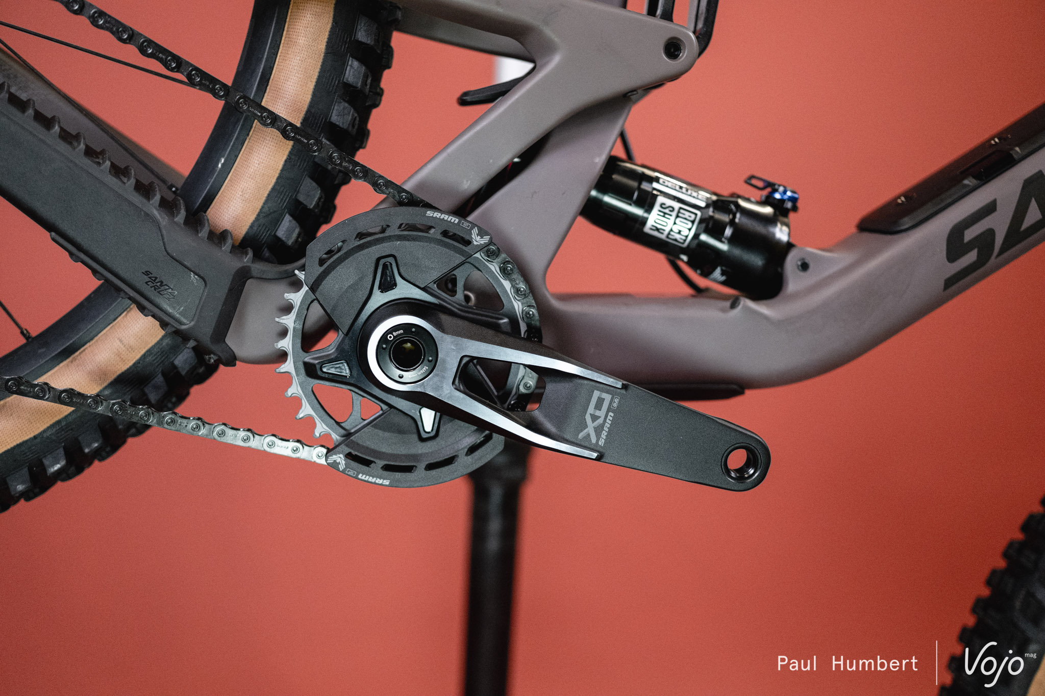 - Pédalier X0 : 360 € (compatible bashguard) / 900 € avec capteur de puissance dans l’axe (compatible bashguard). Plateau en 32 dents et manivelles en 165, 170 ou 175 mm.