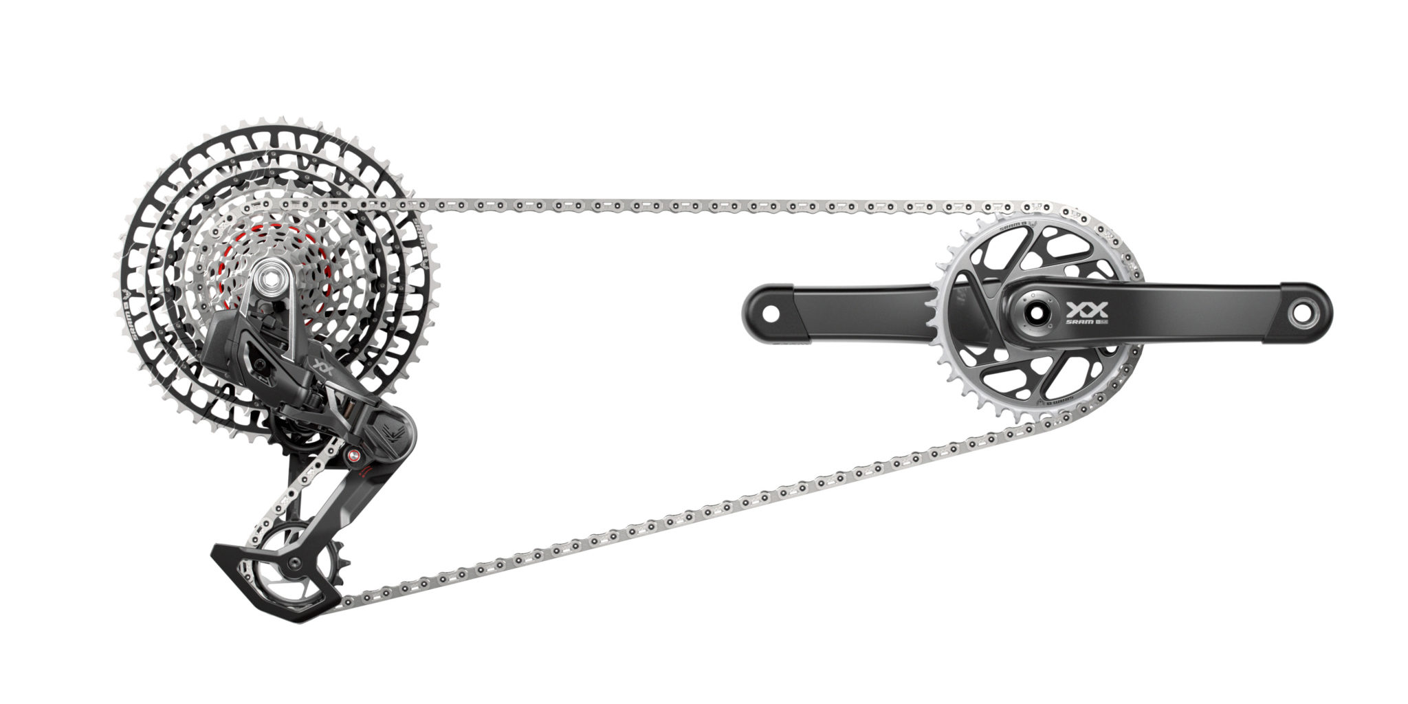 Ce n’est pas une surprise, la nouveauté arrive par le haut de gamme. Aujourd’hui, Sram présente trois groupes : le XX, le XX SL et le X0. On remarque la disparition du « 1 » dans les noms et le retour aux dénominations historiques XX et X0, qui ne manqueront pas de rappeler des souvenirs. Peut-être aussi un clin d’oeil à la révolution apportée par le lancement du groupe XX en 2009, première transmission double plateau de série de l’histoire du VTT ?