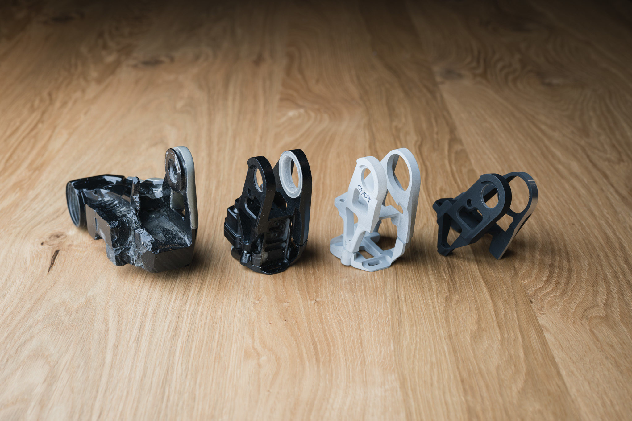Même les arêtes qui soulignent les différents éléments du « corps » du dérailleur ne sont pas là par hasard : leur forme a été pensée pour dévier les coups et les diriger vers les zones les mieux à même de les supporter.