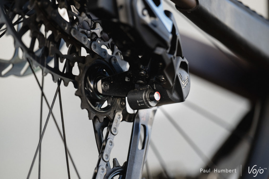 Plus de patte de dérailleur, ça a aussi un intérêt majeur pour l’installation et le réglage du système. Aujourd’hui, les vis de butées haute et basse servent à compenser les petites variations de position qu’il peut y avoir entre les différents cadres et leurs pattes de dérailleur. Si le dérailleur est fixé directement sur le cadre et que l’interface est la même partout, elles n’ont plus lieu d’être. Sram sait à l’avance précisément où sera le dérailleur vis-à-vis de la cassette alors à quoi serviraient des réglages ?