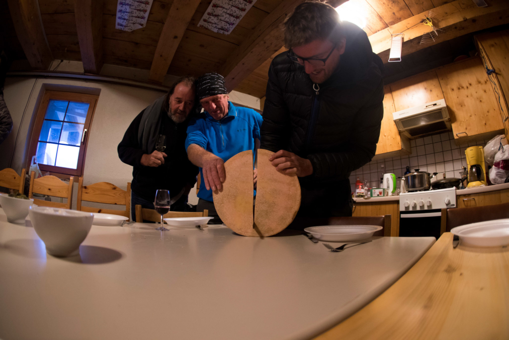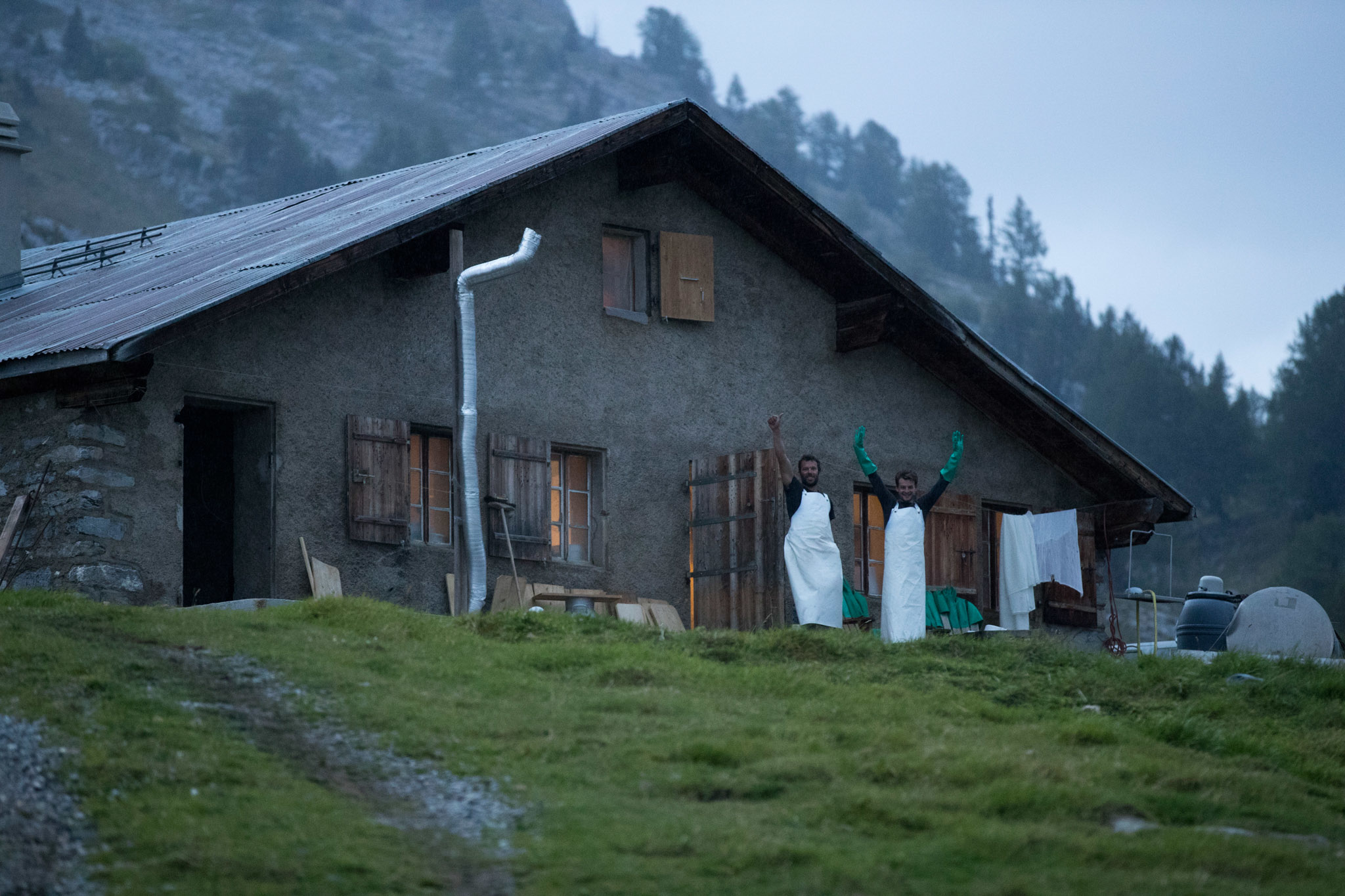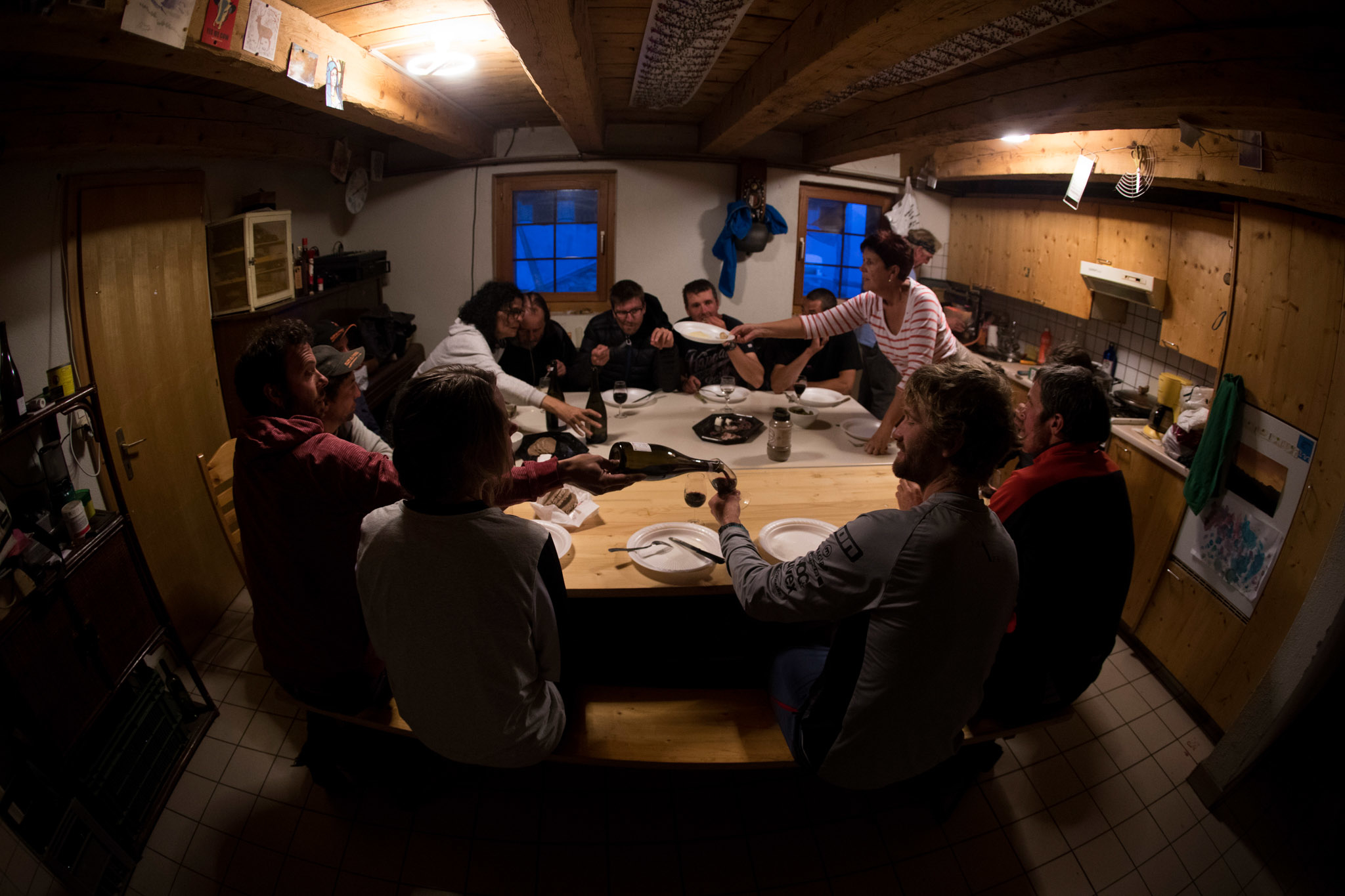 Il y a aussi l’alpage du Pointet, l’un des plus gros exploitants de la vallée. Six personnes y travaillent à la haute-saison : deux à la traite, deux à la fabrication de fromage et deux en tant que bergers. Aujourd’hui, c’est Bertrand, le fils, qui a repris l’entreprise de ses parents. Le soir de notre arrivée, ils avaient organisé un vrai festin : un apéro riche de tous les produits locaux – à se remplir trois fois plus le ventre qu’il n’en faudrait ! –suivi d’une inévitable raclette. A table, tous les employés parlaient et riaient comme des amis de longue date. L’ancien patron, Stéphane, a passé sa soirée à nous servir la raclette, aidé par sa femme, Marie-Noëlle. Ils ne se sont pas assis une seule fois, veillant à ce que tout ce monde puisse profiter du moment. Avec Jamie, Max et Gary, nous avons eu le même sentiment : ces personnes travaillent dur mais n’en perdent pas pour autant les valeurs d’échange, de partage et de respect, peu importe la hiérarchie.